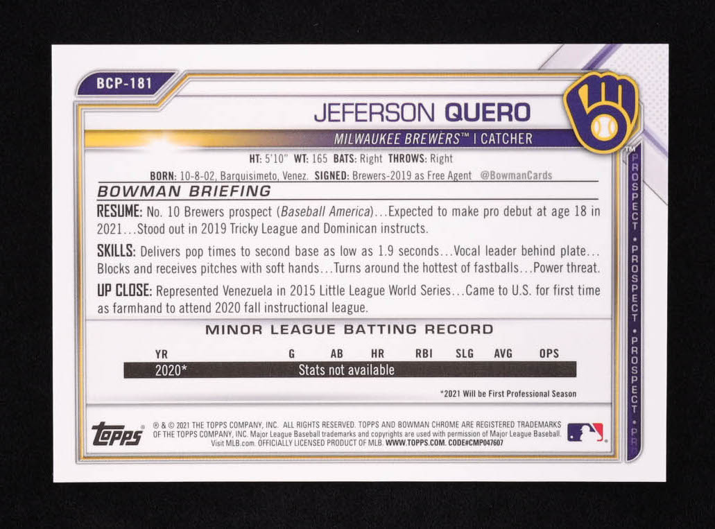 Jeferson Quero 2021 Bowman Chrome Prospects Purple Shimmer Refractors #BCP181 #229/250 RC