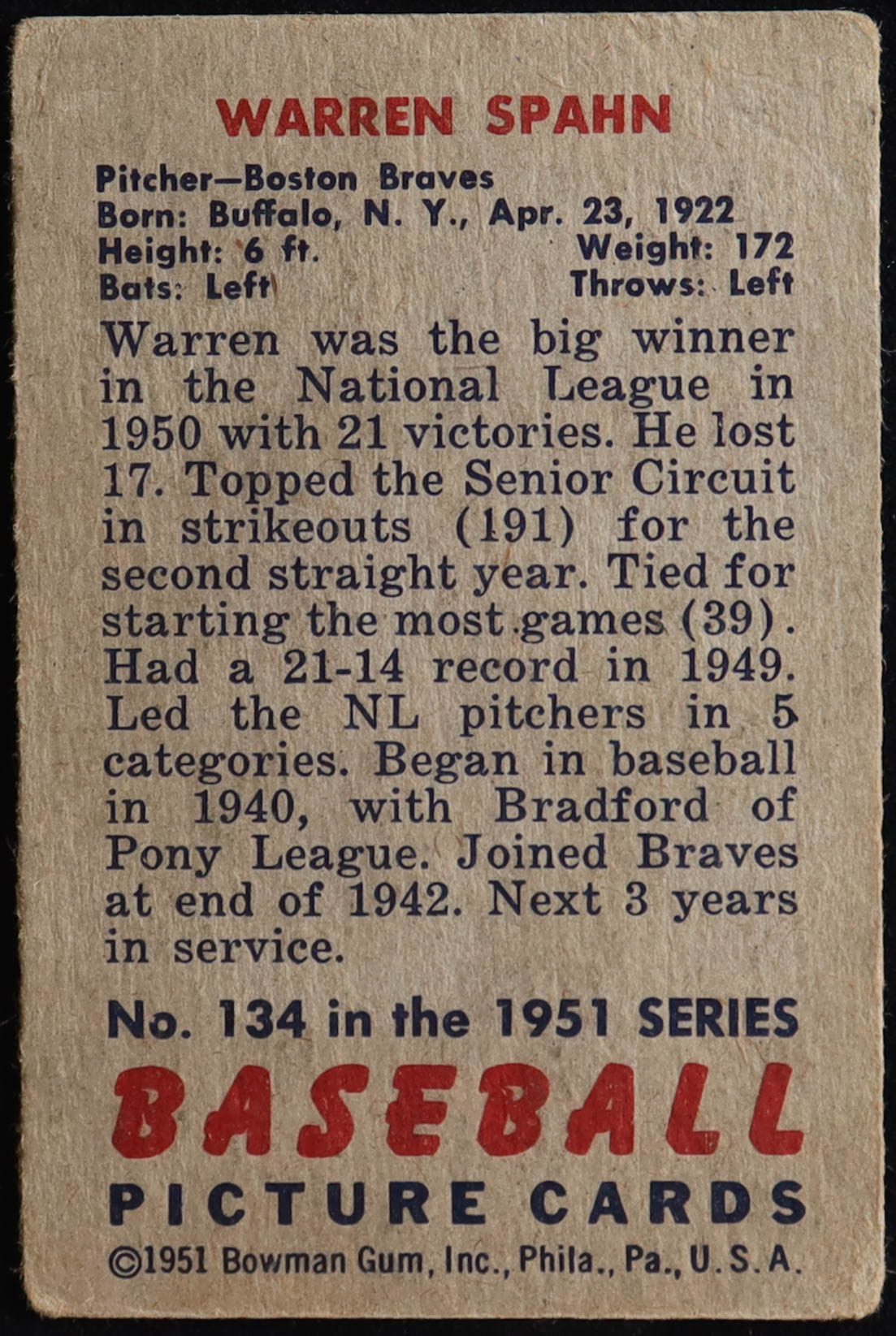 Warren Spahn 1951 Bowman #134