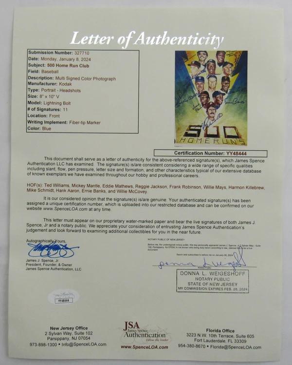 Custom frame measures approximately 16" x 17" in size and features an 8" x 10" photo hand-signed by (11) including Mickey Mantle (HOF, D. 1995), Hank Aaron (HOF, D. 2021), Willie Mays (HOF), Reggie Jackson (HOF), Eddie Murray (HOF), Ted Williams (HOF, D. 2002), Willie McCovey (HOF, D. 2018), Mike Schmidt (HOF), Ernie Banks (HOF, D. 2015), Harmon Killebrew (HOF, D. 2011) and Frank Robinson (HOF, D. 2019).