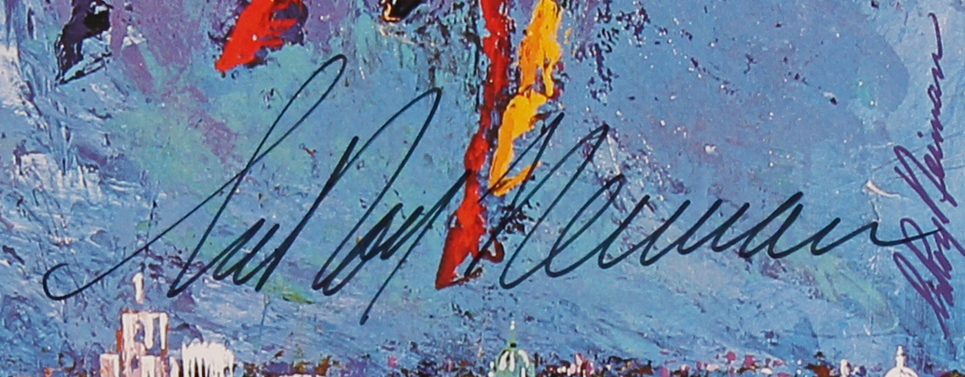Custom frame measures 18" x 23" in size. Hand-signed in black felt tip pen by artist Leroy Neiman.