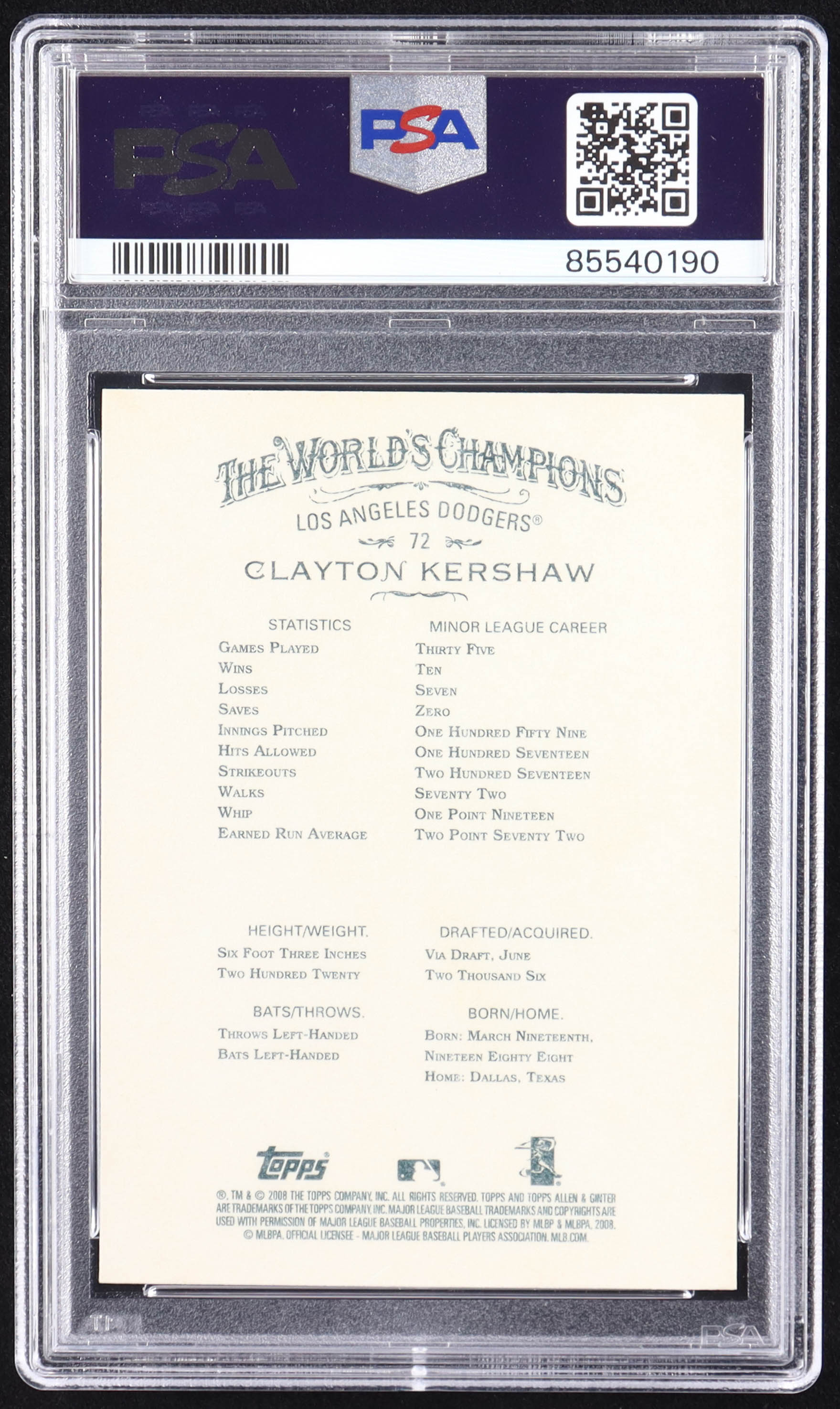 Clayton Kershaw 2008 Topps Allen and Ginter #72 RC (PSA 10)