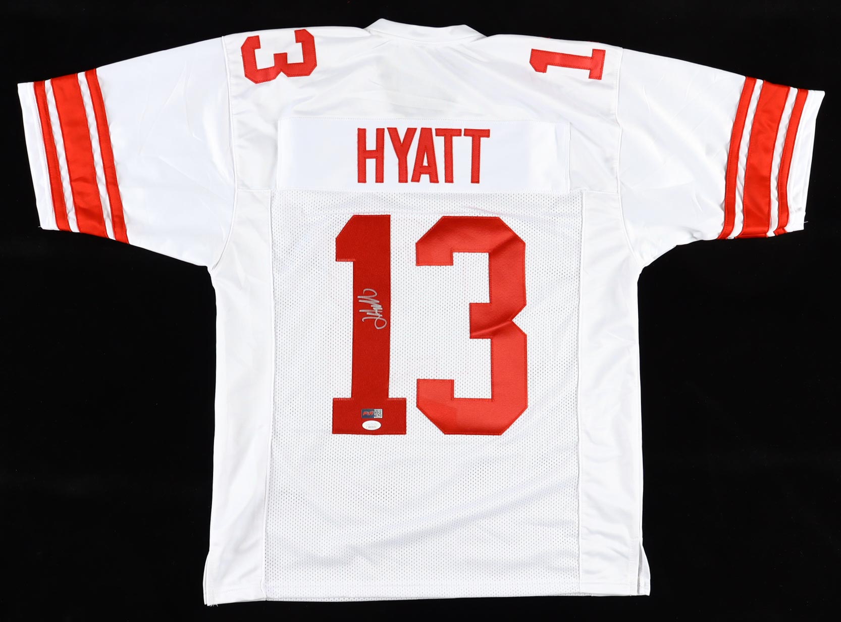Custom jersey with everything sewn on, size XL. Hand-signed by Jalin Hyatt. Please note, there is a stain on the front of the jersey. See photos for more details.