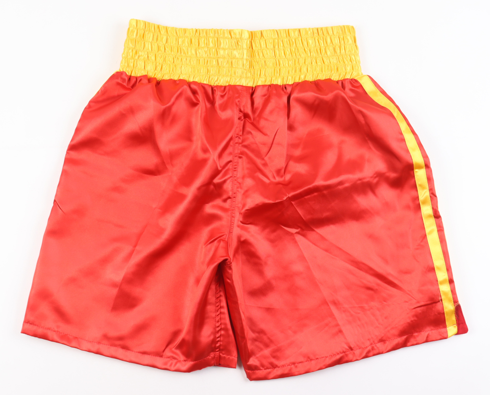 Boxing trunks, size XL. Hand-signed and inscribed by Dolph Lundgren.