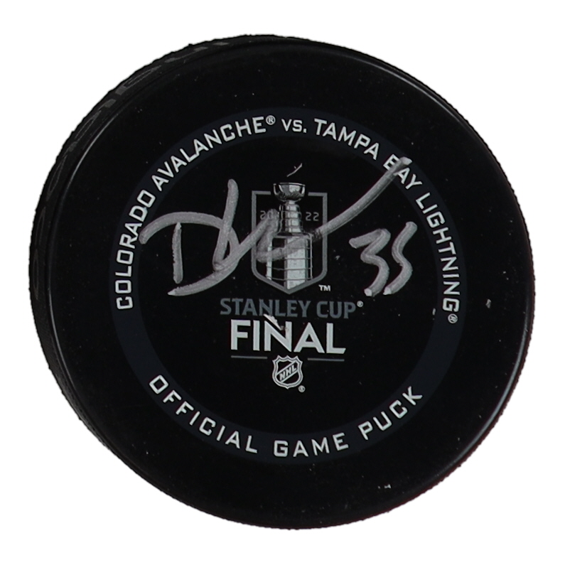2022 Stanley Cup Final Official Game hockey puck has been hand-signed by Darcy Kuemper (Colorado Avalanche).
