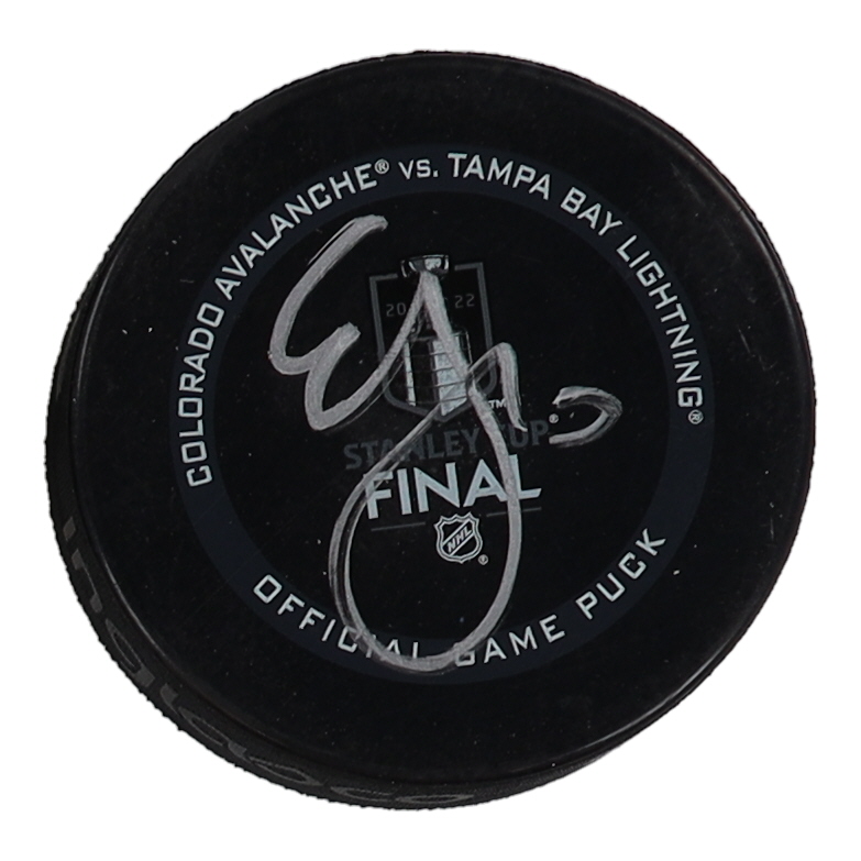 2022 Stanley Cup Final Official Game hockey puck has been hand-signed by Erik Johnson (Colorado Avalanche).