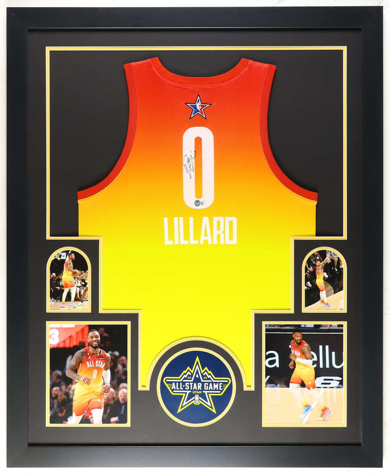 Custom frame measures approximately 35" x 43" in size and features a jersey that has been hand-signed by Damian Lillard.