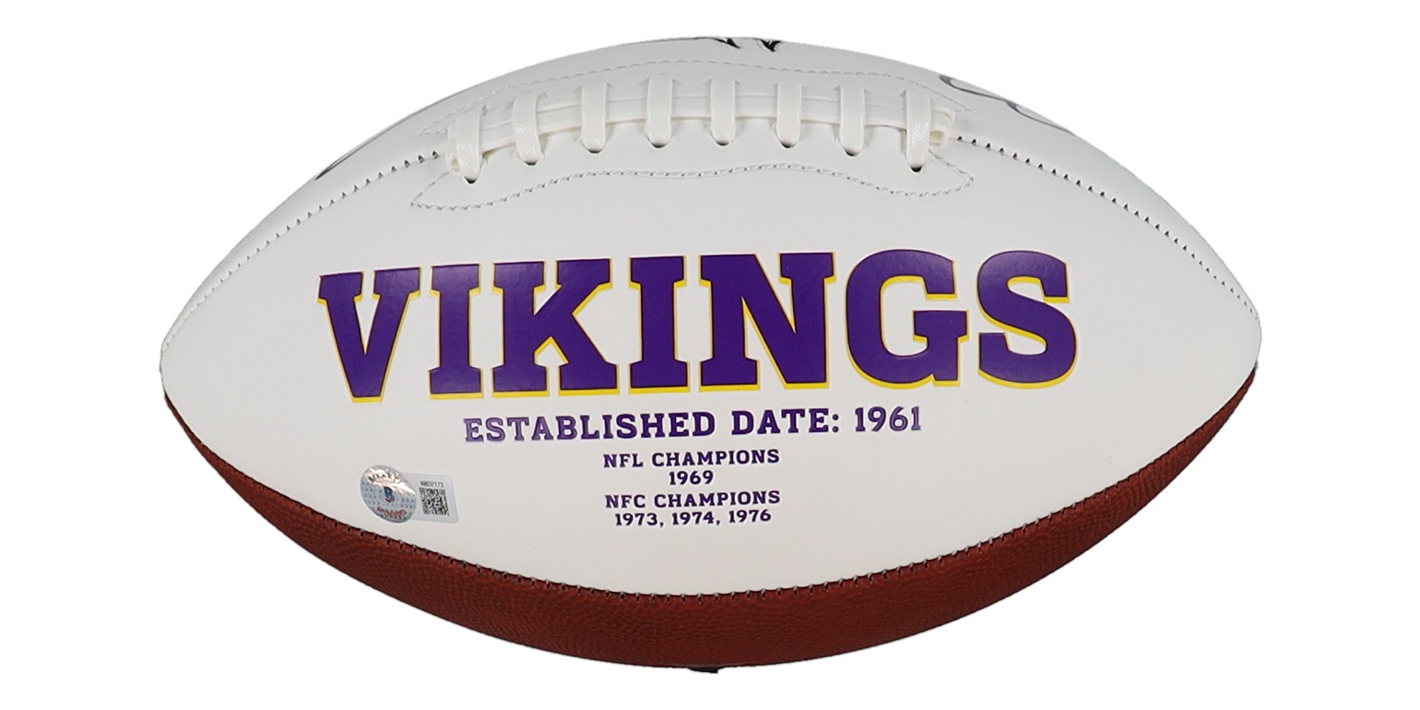 Minnesota Vikings logo football has been hand-signed by Justin Jefferson and Jordan Addison. Please note, the signatures have bled.