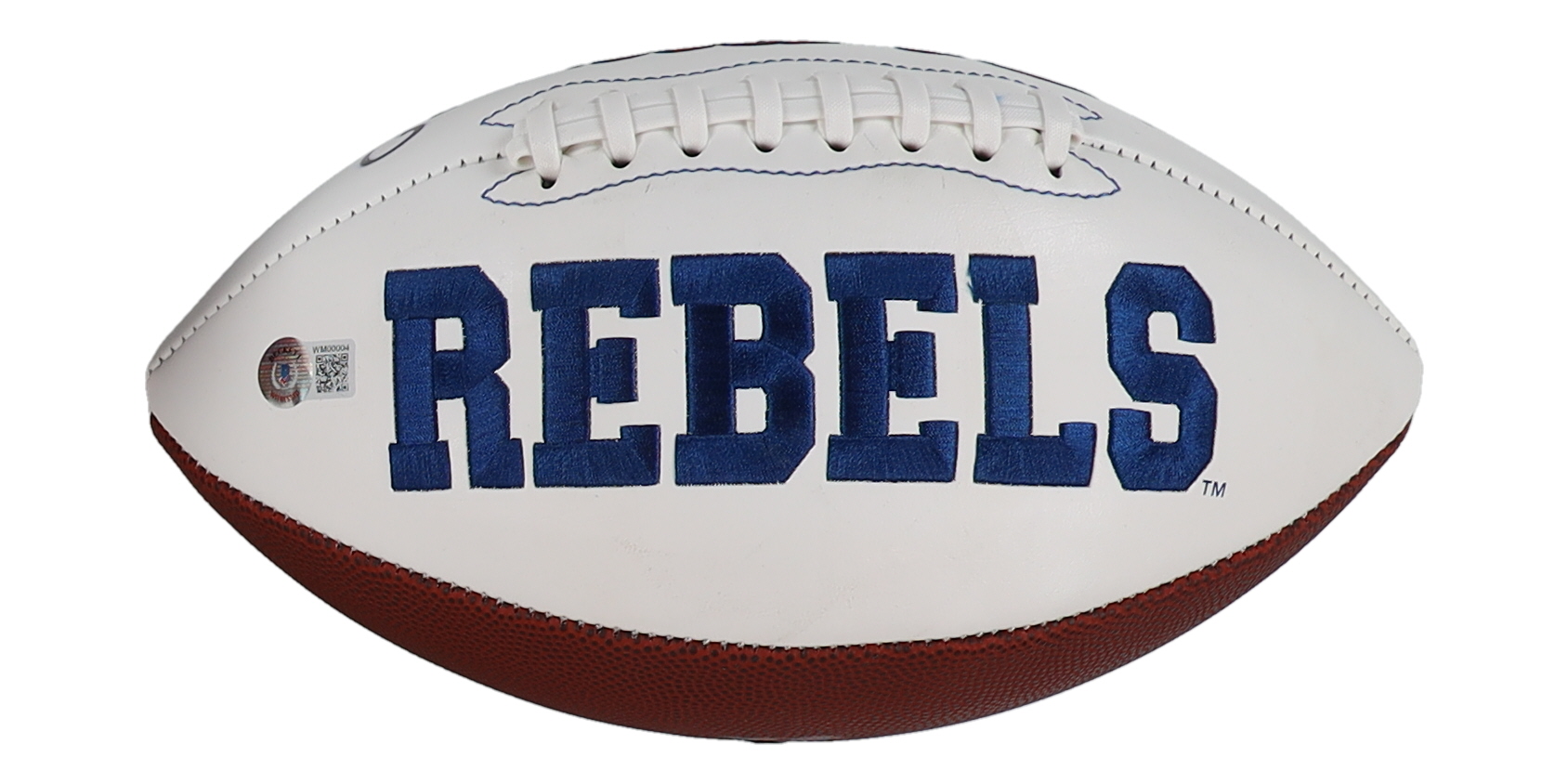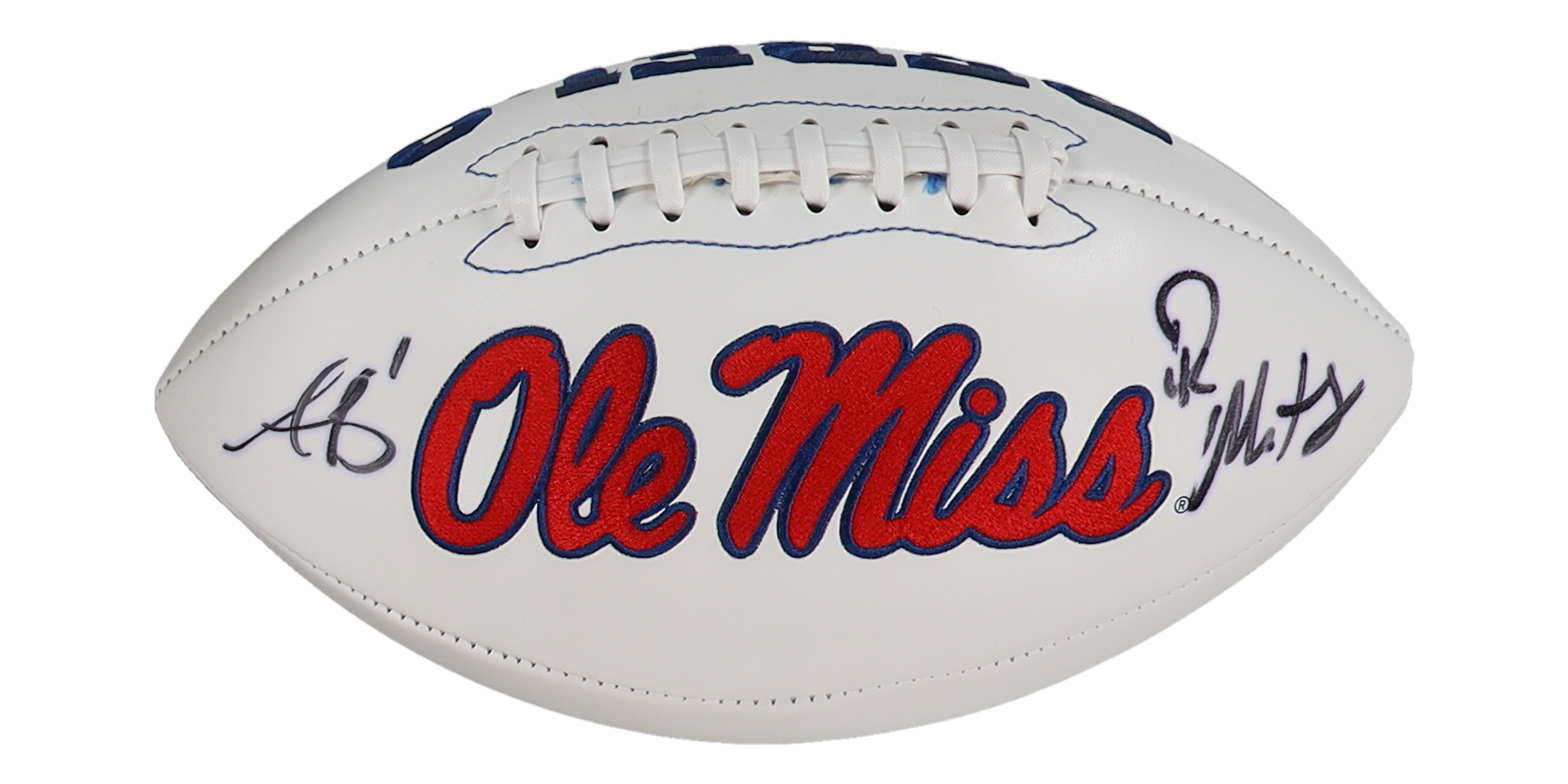 Ole Miss Rebels logo football has been hand-signed by D.K. Metcalf and A.J. Brown.