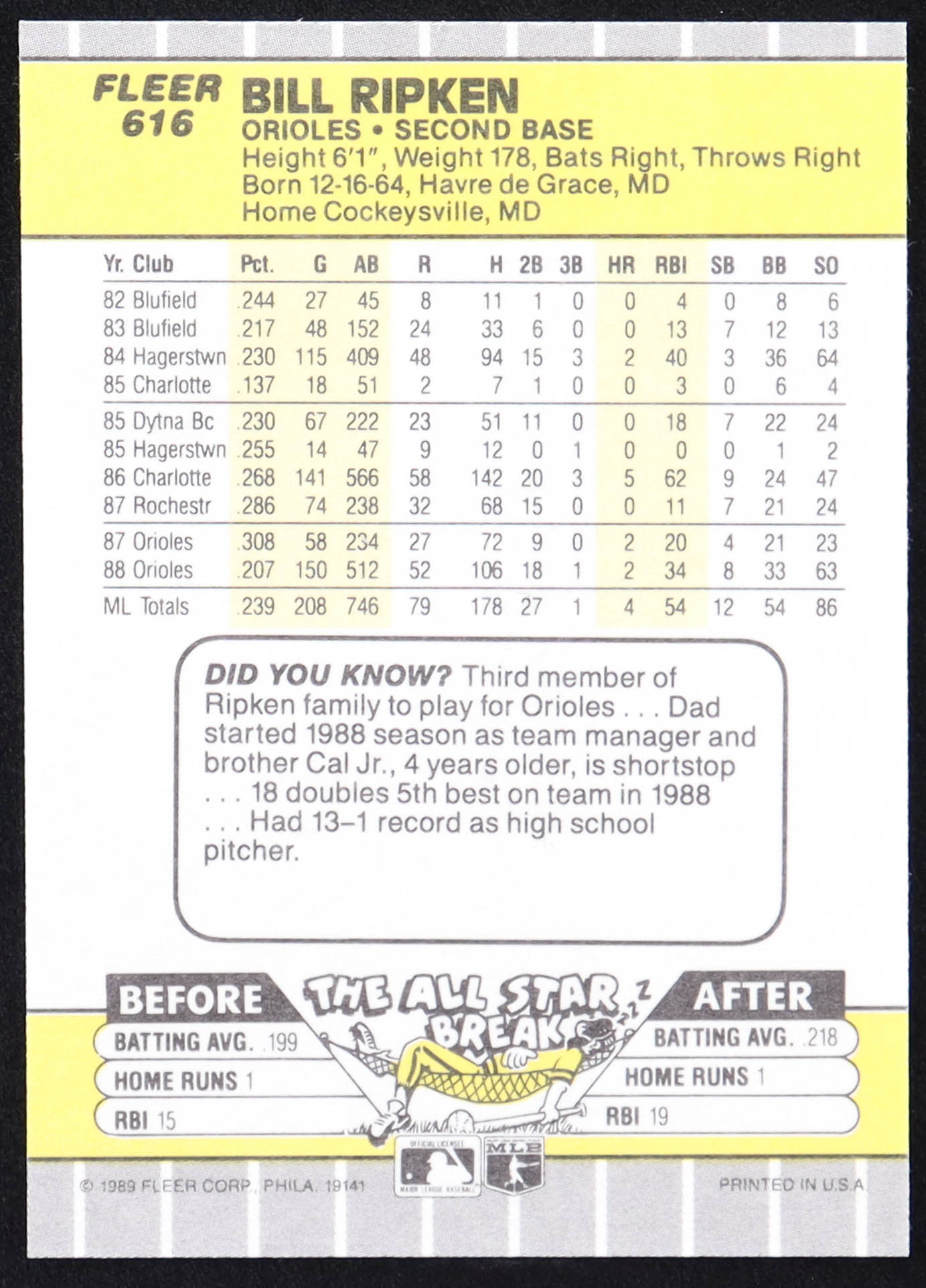 Bill Ripken 1989 Fleer #616E DP / Black Box Covering Bat Knob