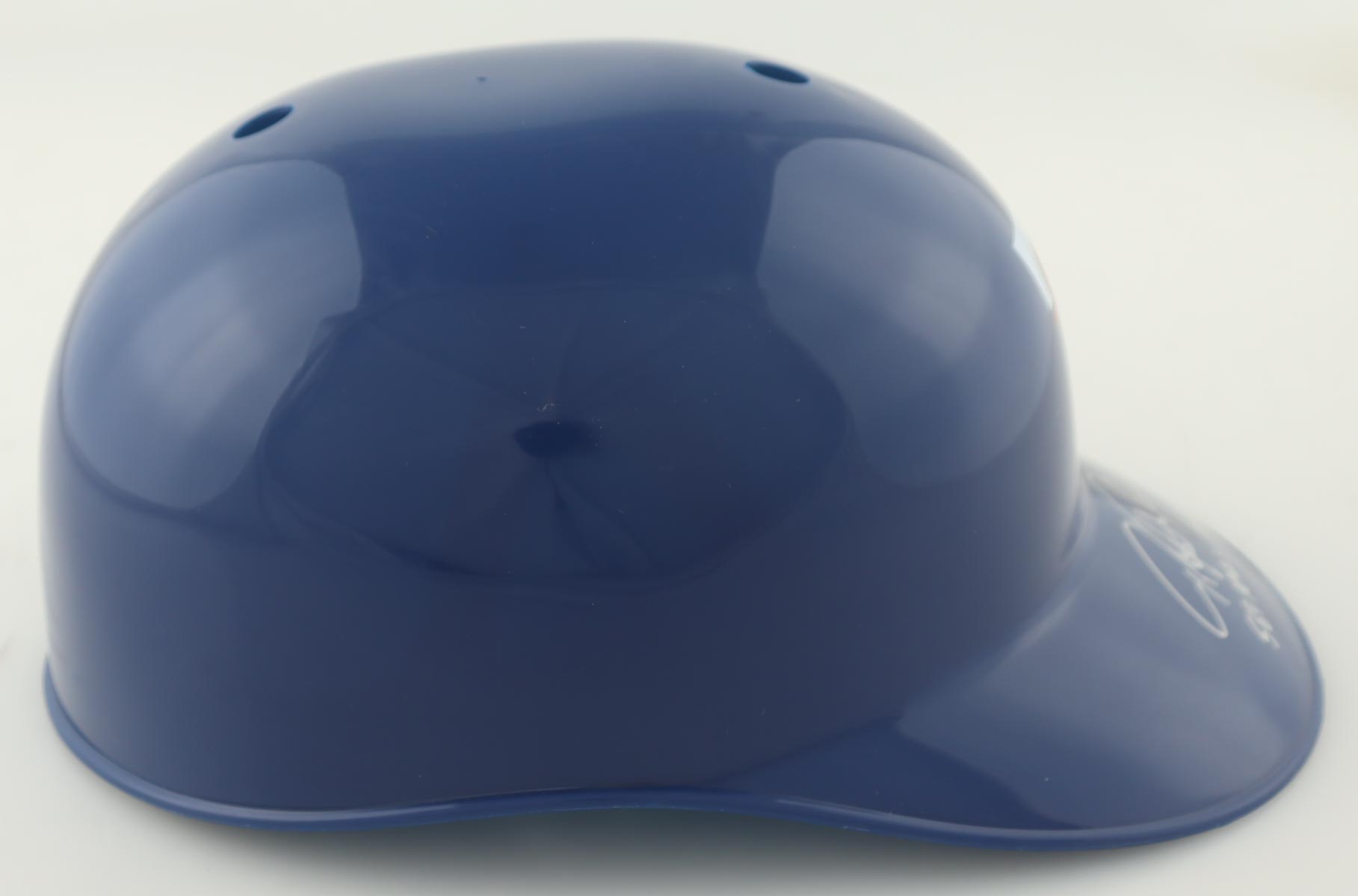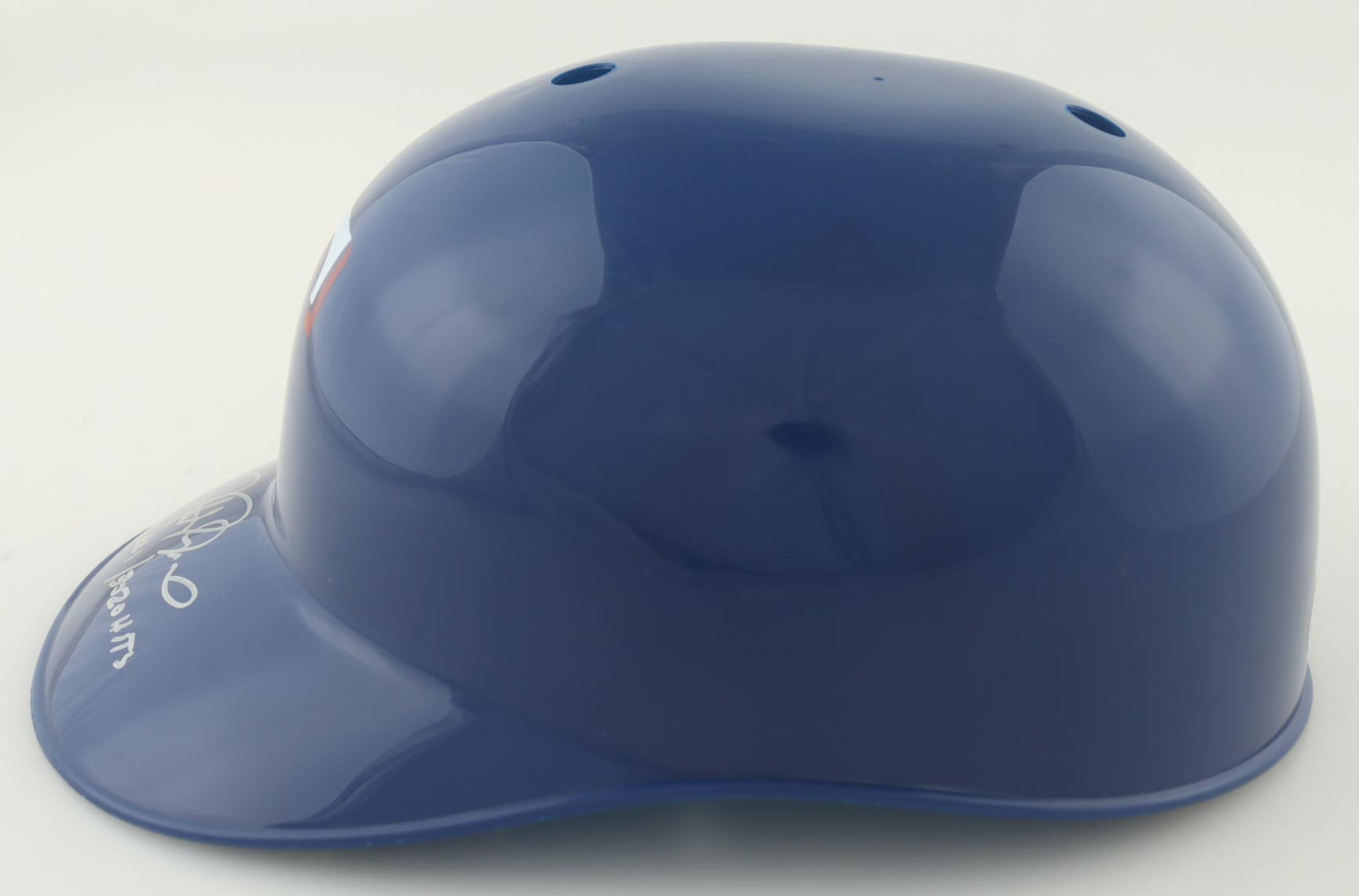 Texas Rangers full-size plastic souvenir replica batting helmet. Hand-signed and inscribed by Rafael Palmeiro.
