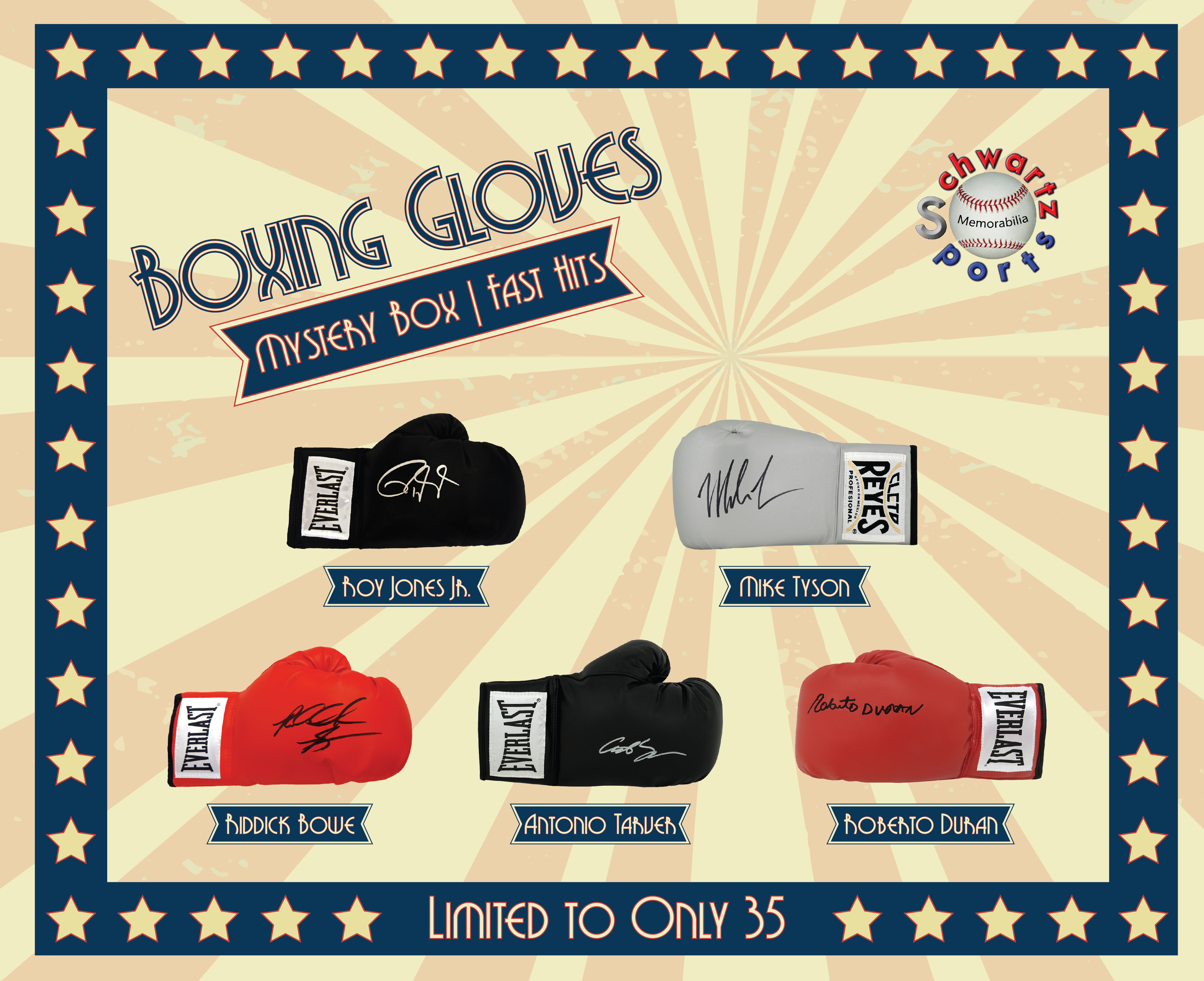 Each box contains one autographed Boxing Glove that has been inserted. There are 22 different Boxers included in this FAST HITS Series 5 Boxing Glove signed Mystery Box, which is a Pristine Exclusive edition that is limited to ONLY 35 boxes.