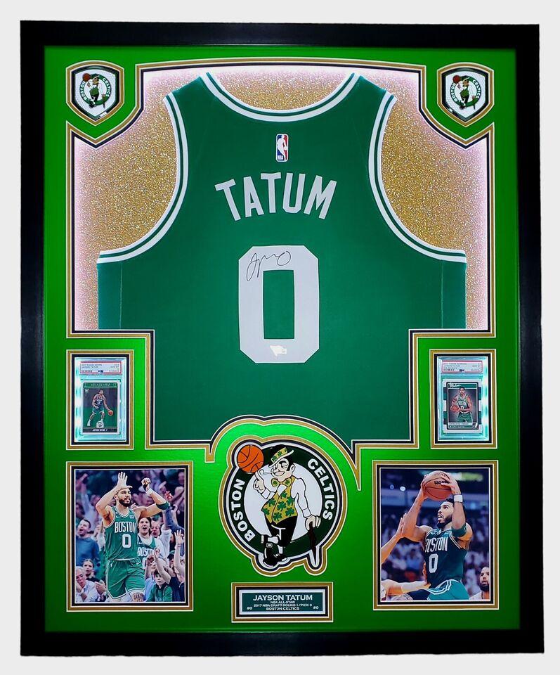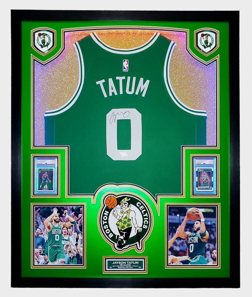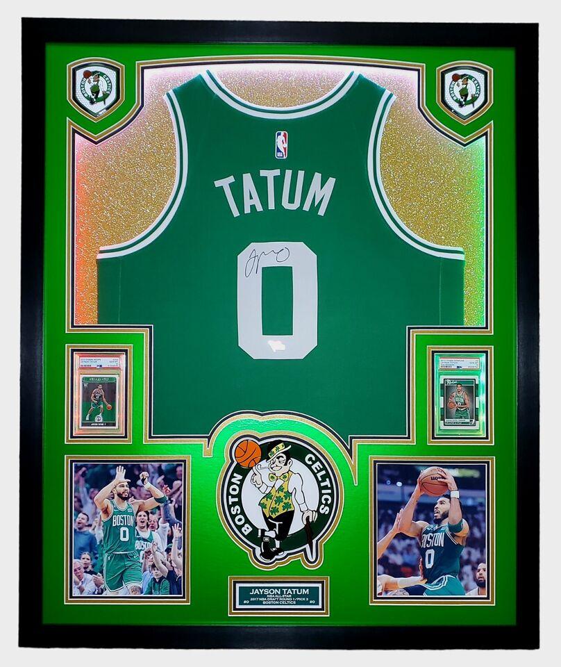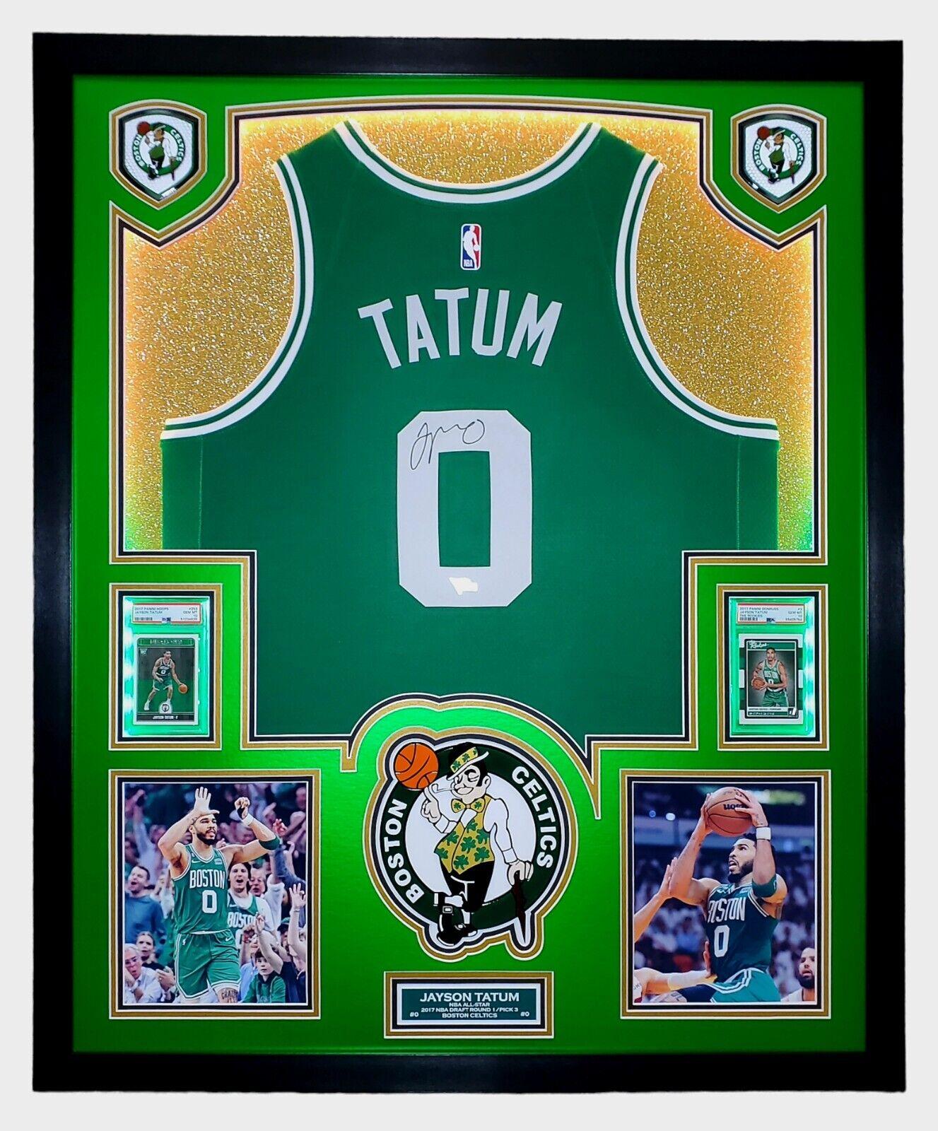 Jayson Tatum Signed Celtics Custom Framed Nike Jersey with LED Display & (2) PSA 10 Graded Rookie Cards (Fanatics)