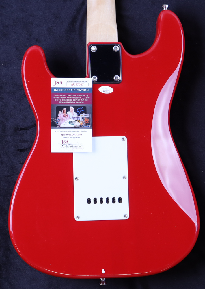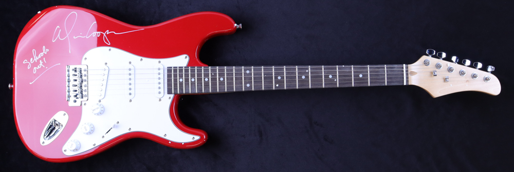 Electric guitar measures approximately 39" in length and has been hand-signed and inscribed on the pickguard by Alice Cooper.