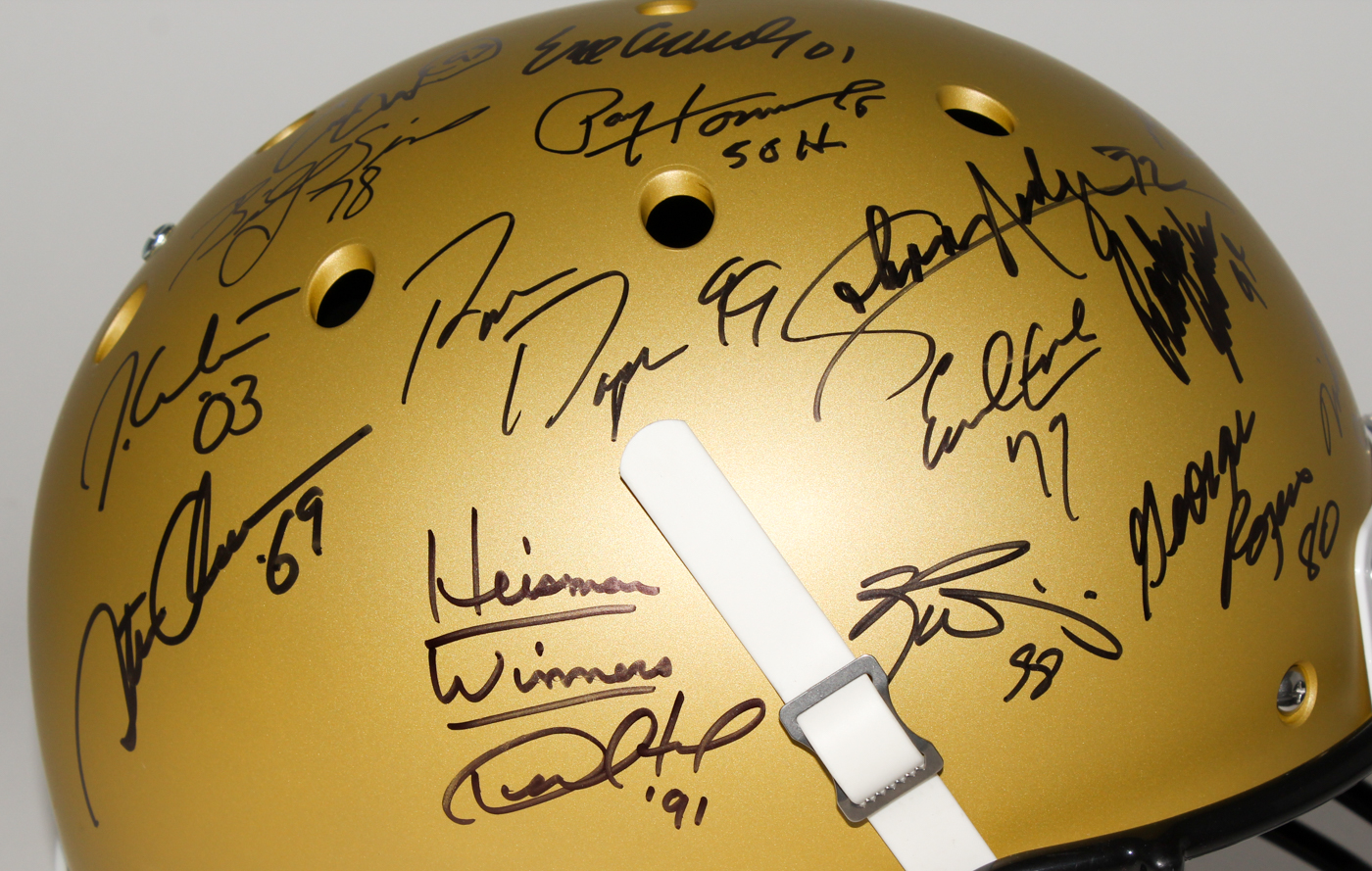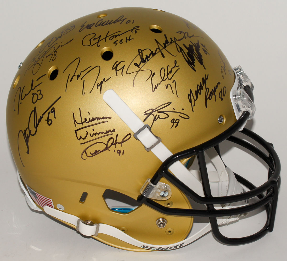 Custom gold matte full-size replica helmet. Hand-signed and inscribed in black felt-tip pen by (24) football players including Marcus Mariota, Earl Campbell, Bo Jackson, Paul Hornung, Barry Sanders, Mark Ingram, Tim Brown, Eric Crouch, Jason White, Ron Dayne, Johnny Rogers, Steve Owens, George Rogers, Rashaan Salaam, Billy Sims, Andre Ware, Charlie Ward, Mike Rozier, Ricky Williams, Eddie George, Archie Griffin, Derrick Henry, Marcus Allen, and Desmond Howard.