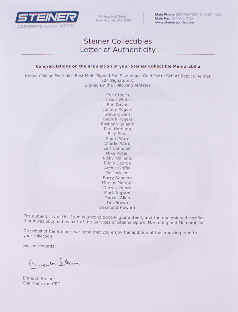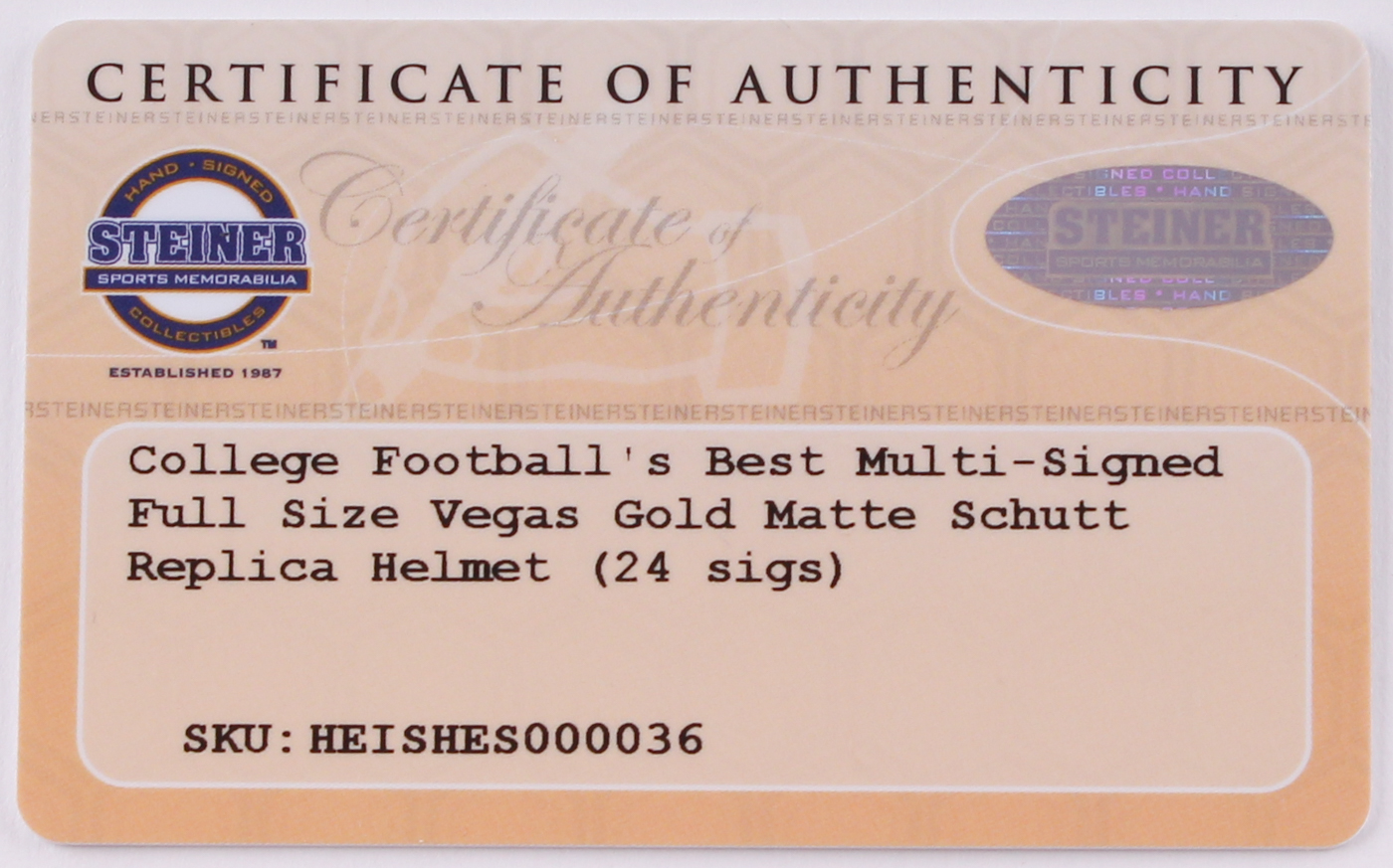 Custom Gold Matte Full-Size Helmet Signed by (24) With Marcus Mariota, Earl Campbell, Bo Jackson, Paul Hornung, Barry Sanders, Mark Ingram, Tim Brown (Steiner LOA)