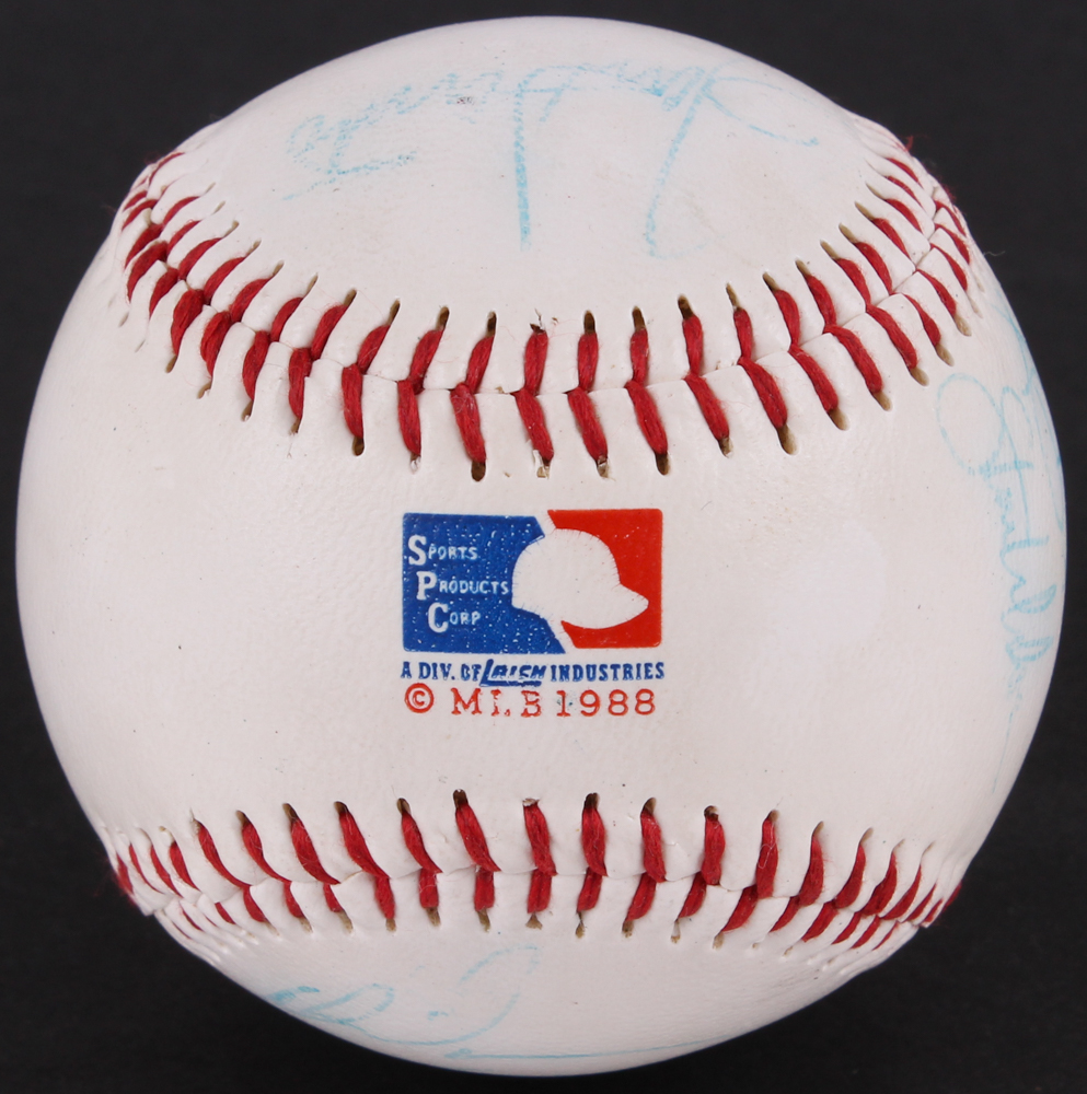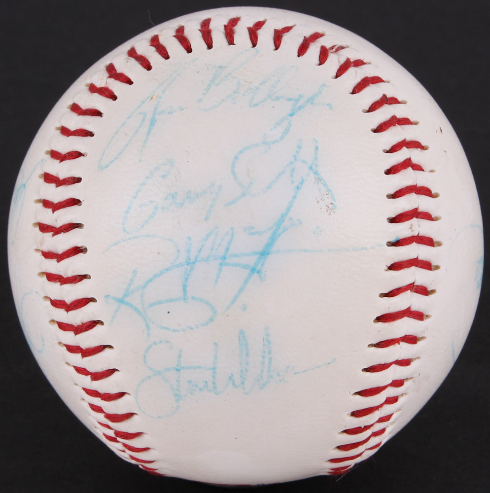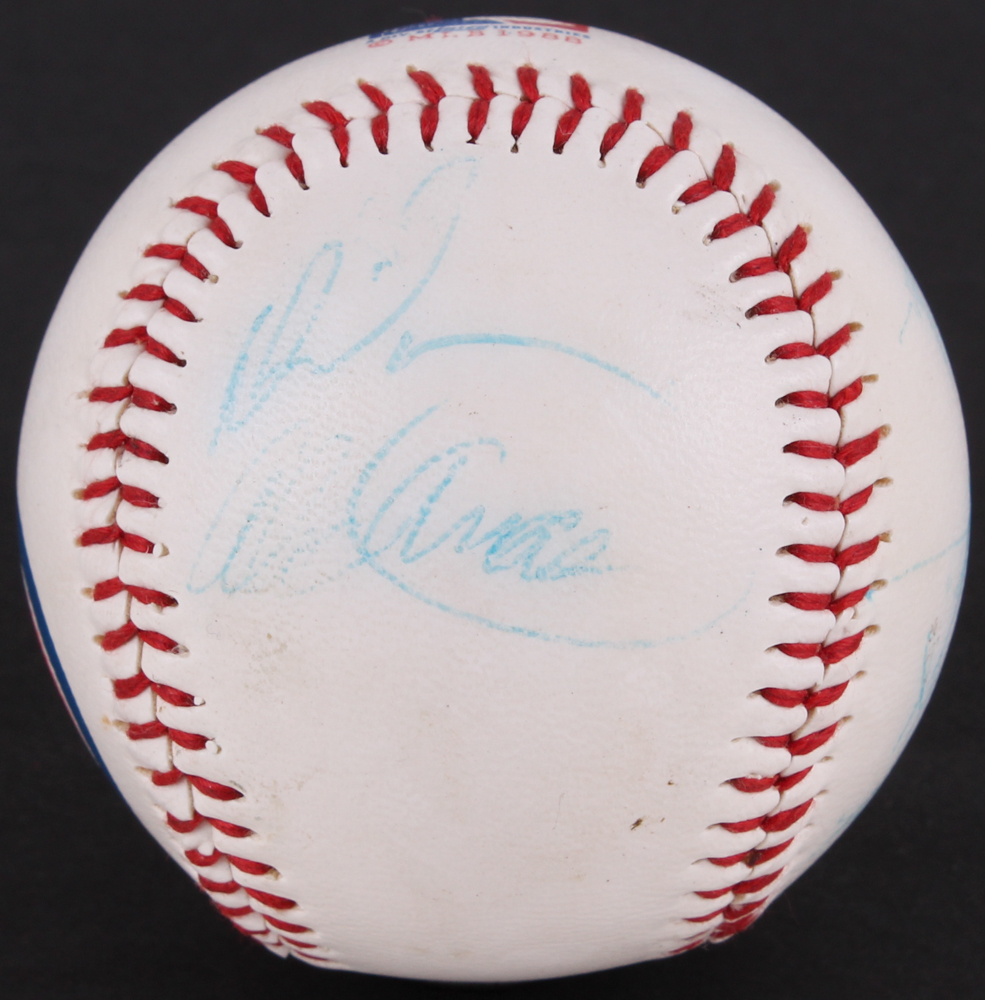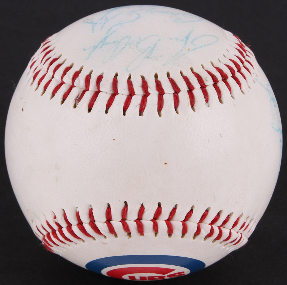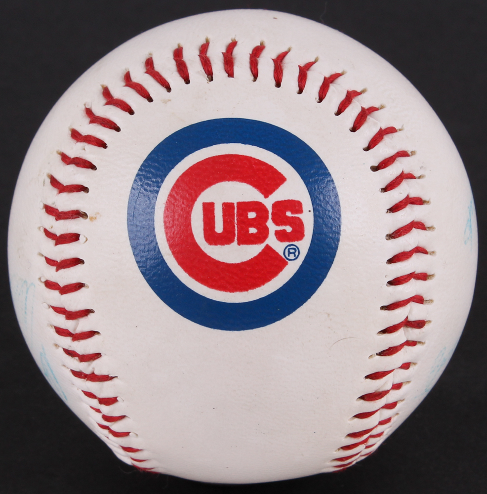 Chicago Cubs logo baseball. Hand-signed in blue ink pen by (8) former Chicago Cubs including Ron Santo, Gary Varsho, Steve Wilson, Alex Arias, Derick May, Gary Scott and (2) others.