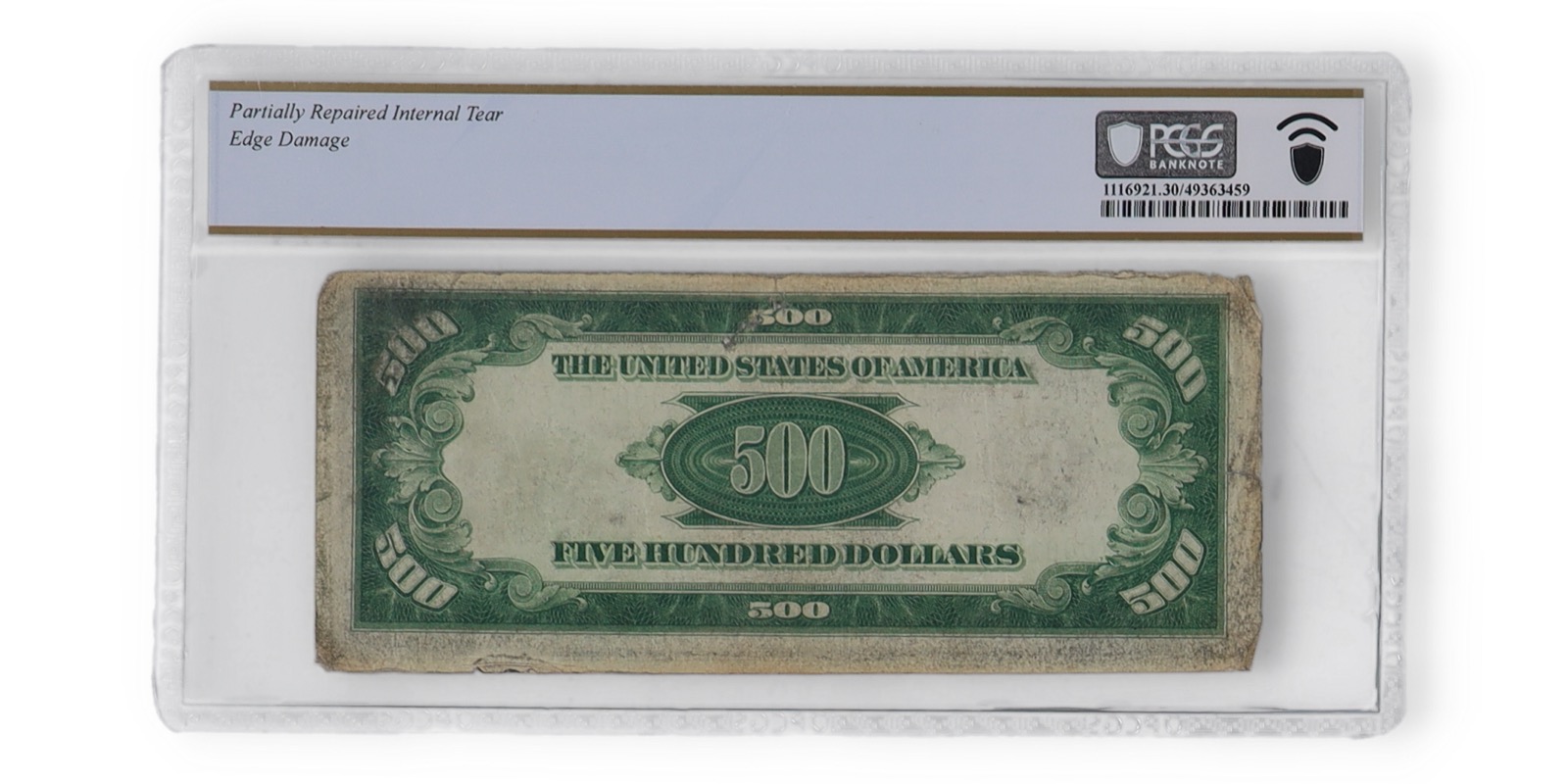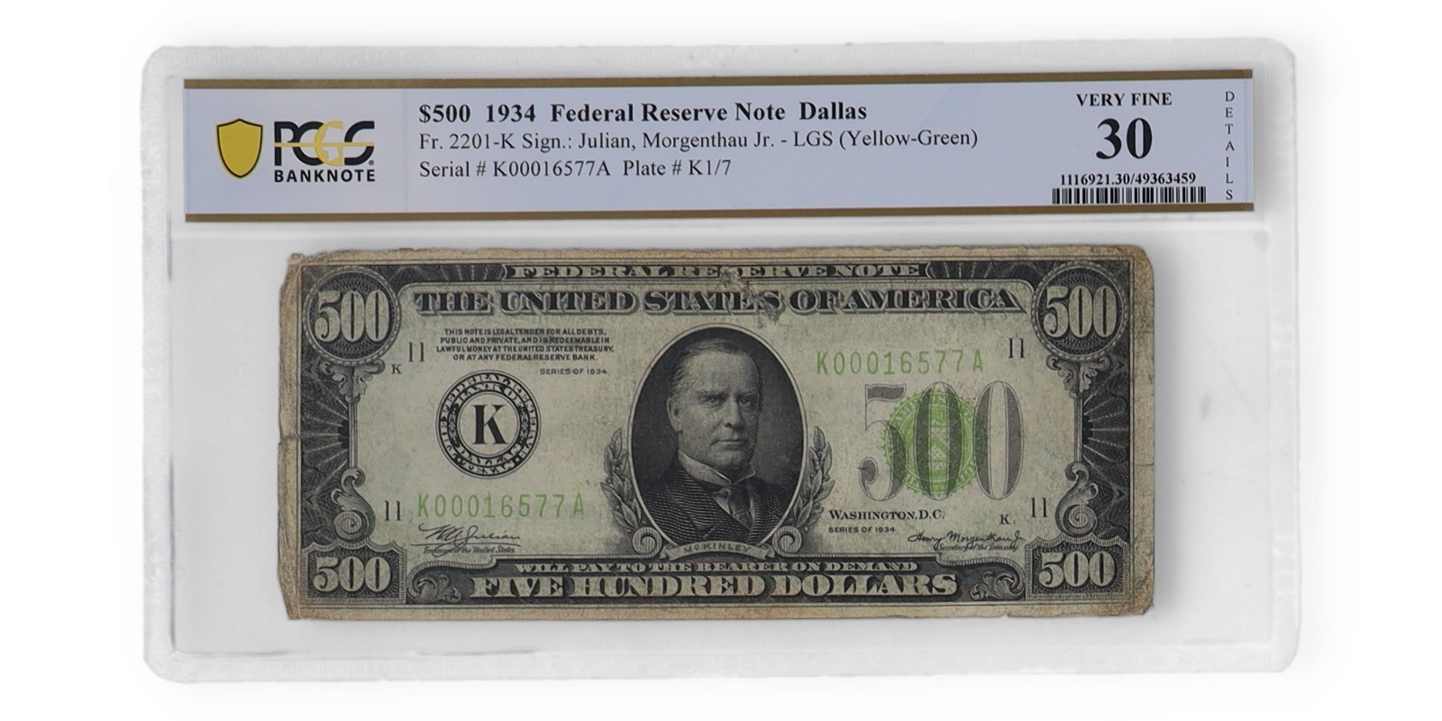 1934 U.S. $500 Federal Reserve Note, Dallas - LGS (Yellow/Green) - 5 Digit Serial Number (PCGS VF30)
