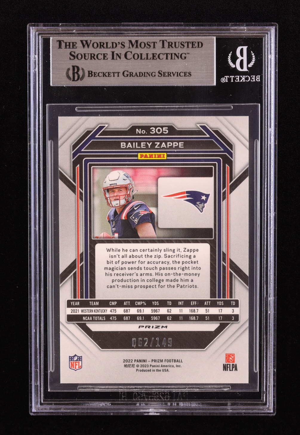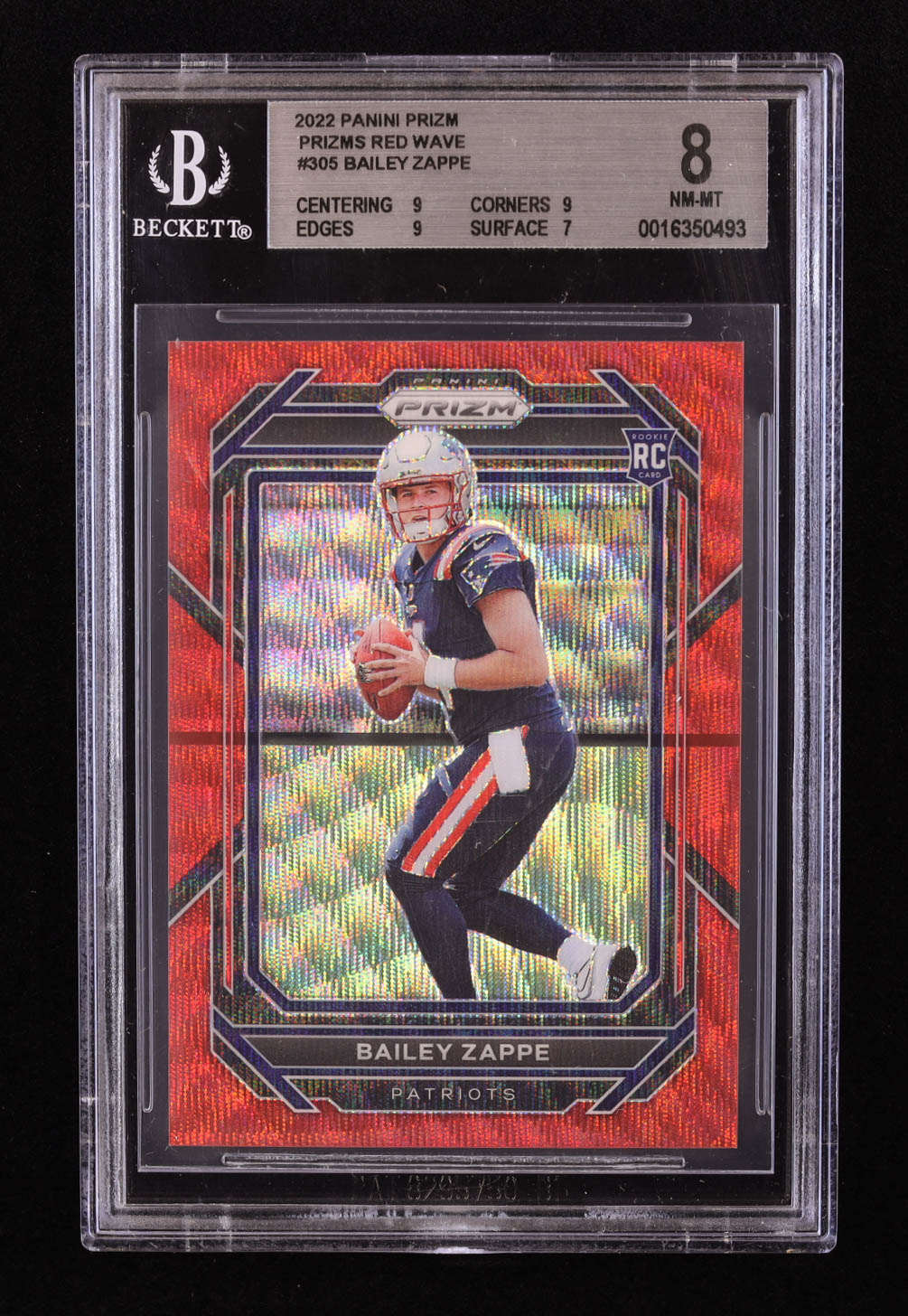 Bailey Zappe 2022 Panini Prizm Prizms Red Wave #305 RC #062/149 (BGS 8)