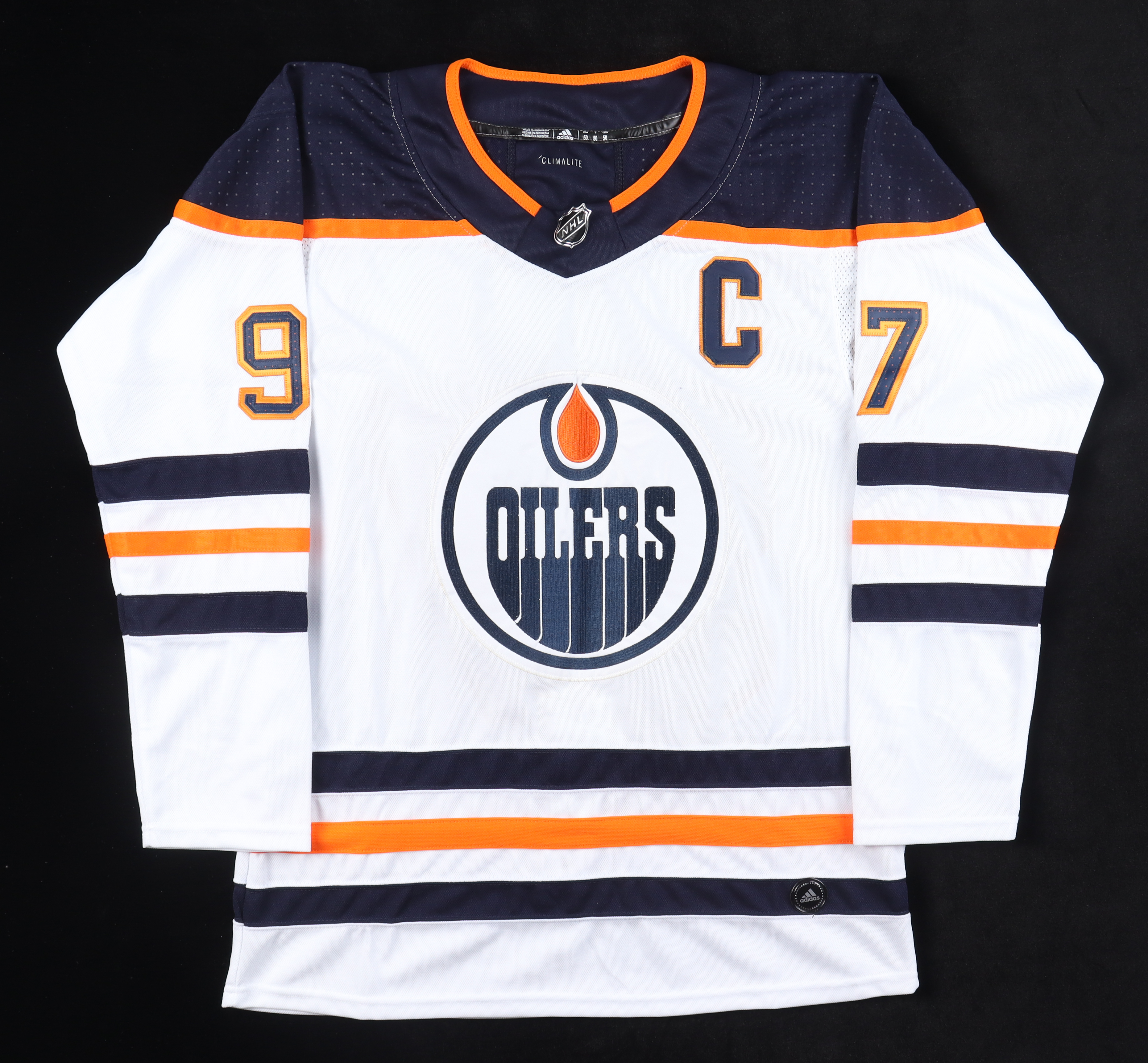 Adidas captain's jersey with everything sewn on, size 52. Hand-signed by Connor McDavid (Edmonton Oilers).