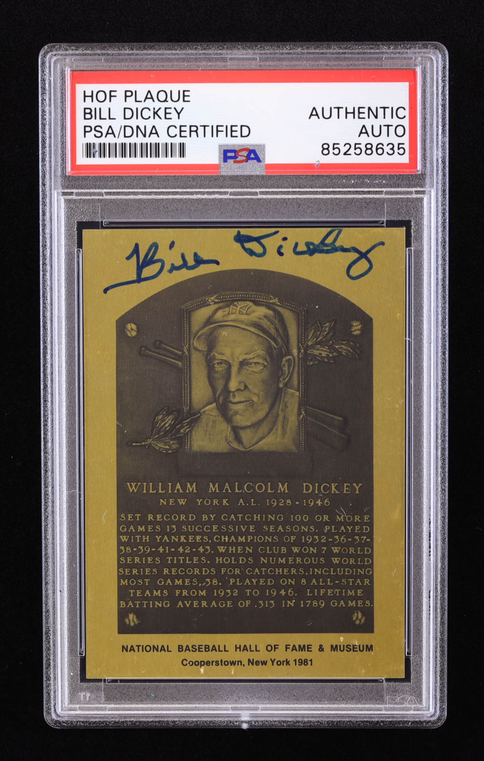 Plaque has been hand-signed by Bill Dickey (D. 1993, New York Yankees, HOF). Please see photos for more details regarding the condition of the plaque.