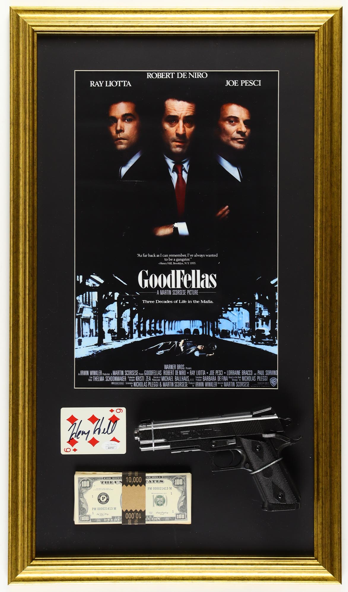 Henry Hill Signed "Goodfellas" Custom Framed Playing Card Display with Poster Print, Prop Money Stack & Replica Prop Pistol (JSA)