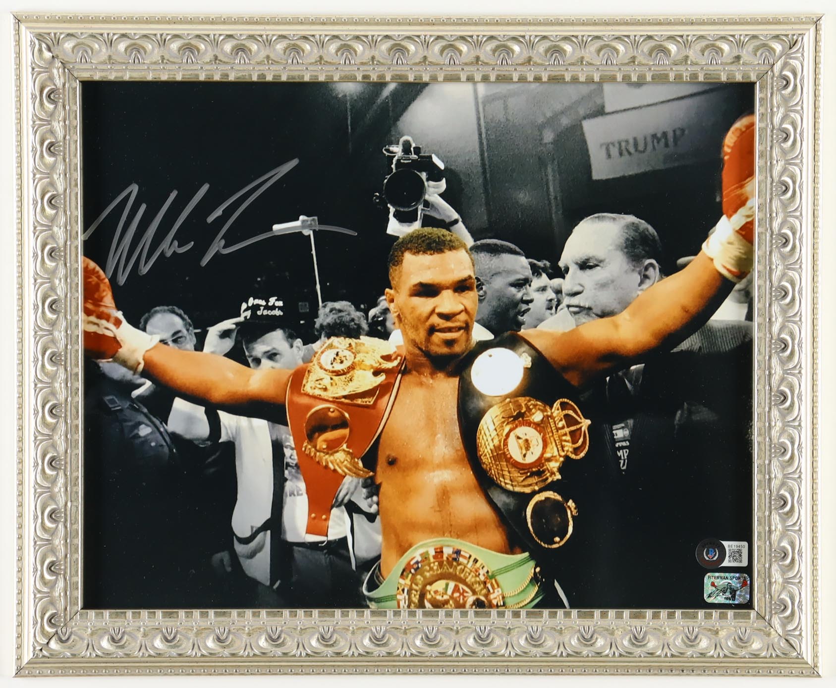 Custom frame measures approximately 13" x 16" in size and features a photo that has been hand-signed by Mike Tyson (HOF).