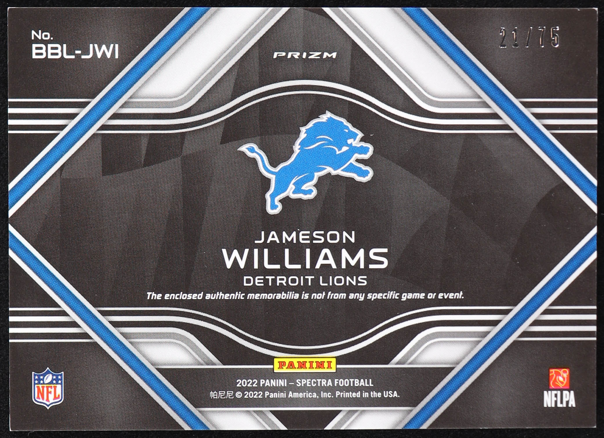 Jameson Williams 2022 Panini Spectra Building Blocks Materials Hyper #15 RC #21/75