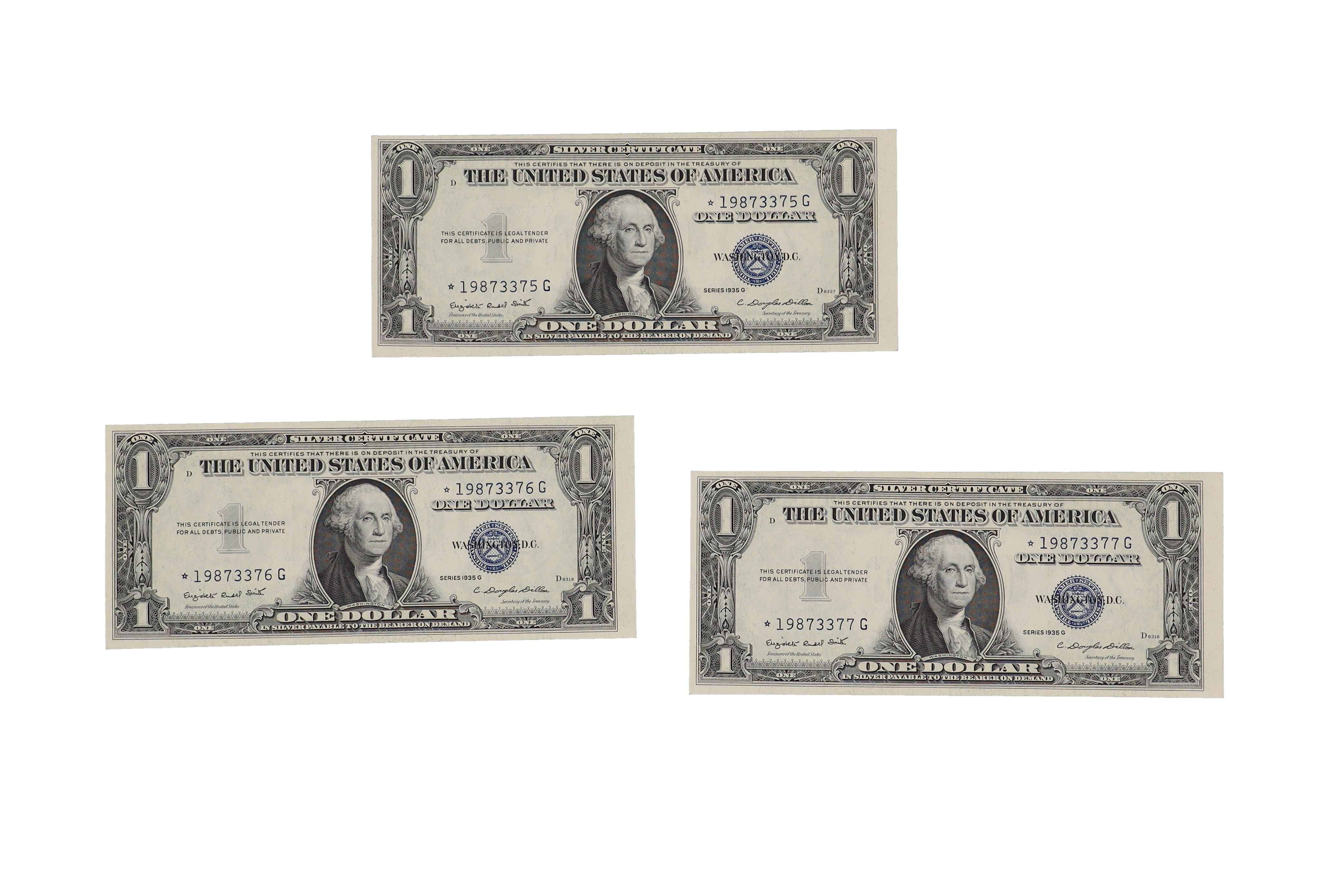 Sequential Set Of (3) Numbered 1935G $1 Dollar Star Note Silver Certificate Bank Notes