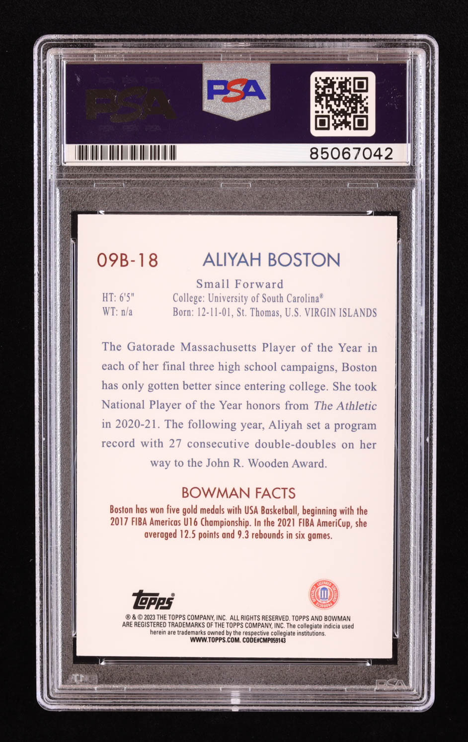 Aliyah Boston Signed 2022-23 Bowman Chrome University '09 Bowman #09B18 RC (PSA)