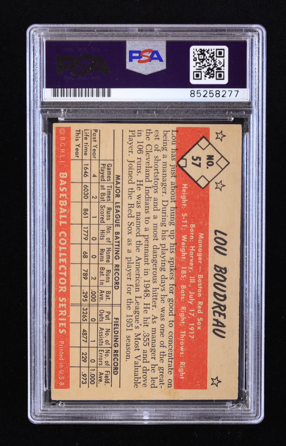 Lou Boudreau Signed 1953 Bowman Color #57 MG (PSA)