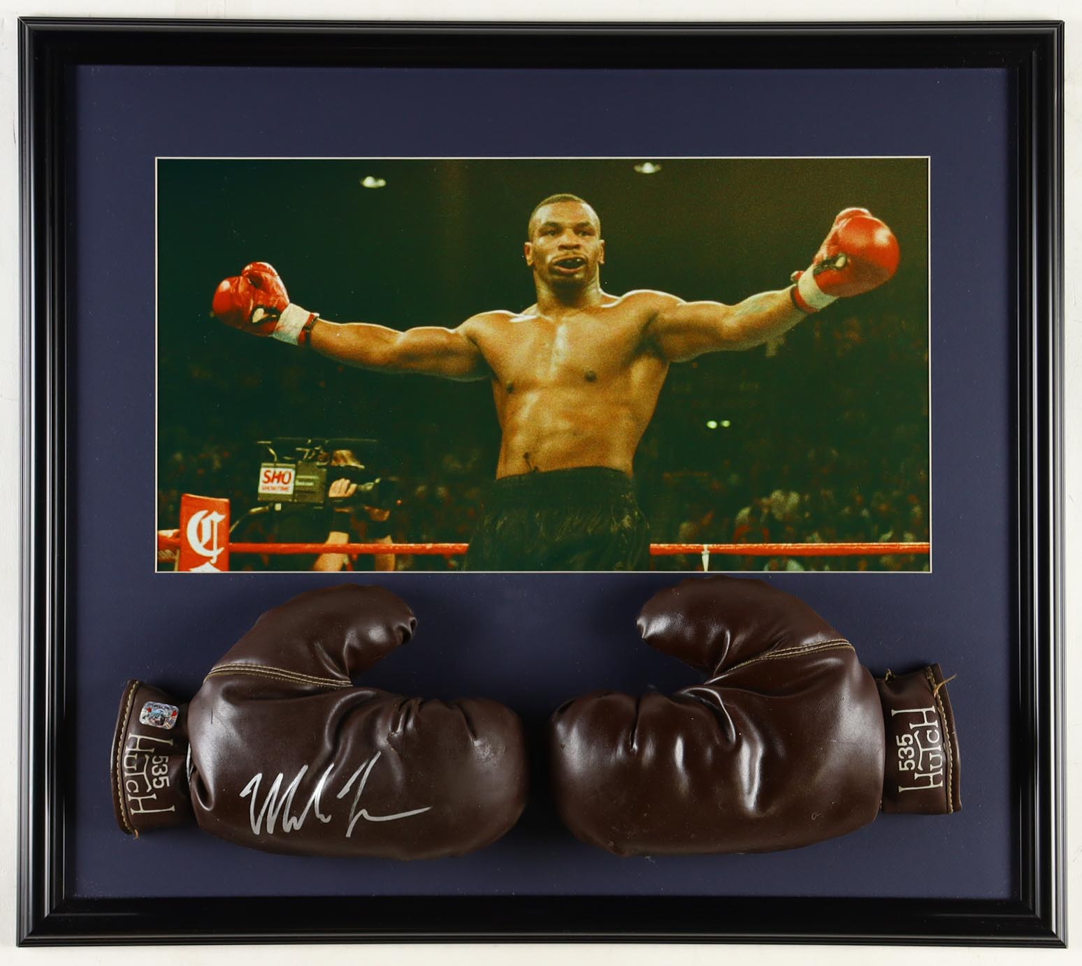 Custom frame measures approximately 23" x 26" in size and features a set of (2) Hutch Boxing Gloves, the right glove has been hand-signed by Mike Tyson (HOF). Please note, there are tears and scuffing on the glove set.