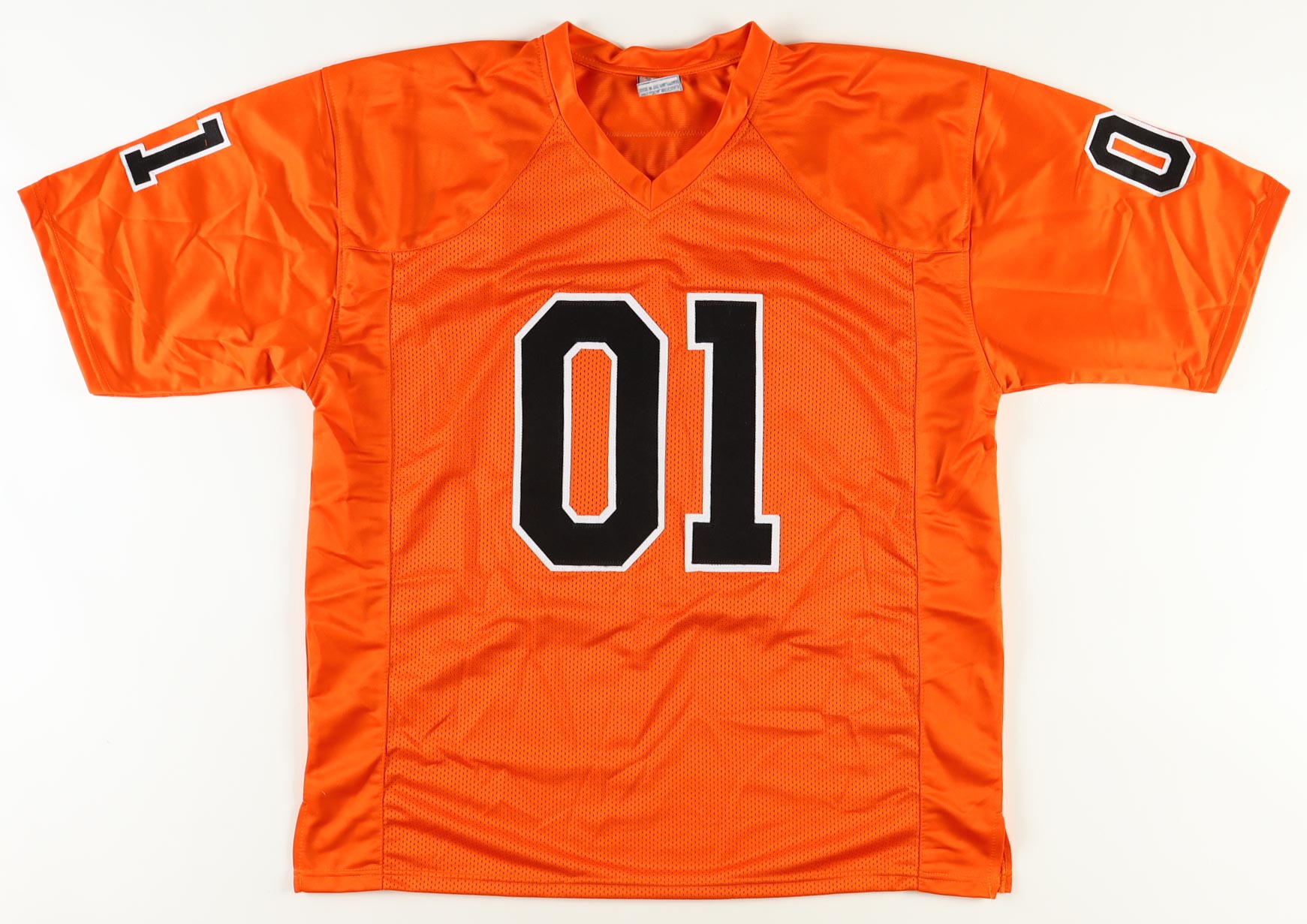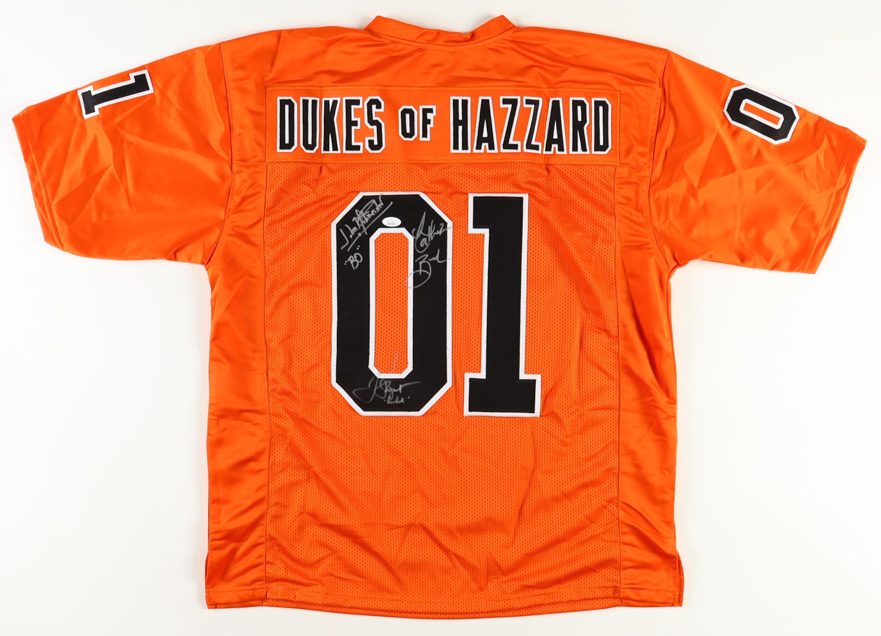 Custom jersey with everything sewn on, size XL. Hand-signed and inscribed by John Schneider (Bo Duke), Catherine Bach (Daisy Duke), and Tom Wopat (Luke Duke).