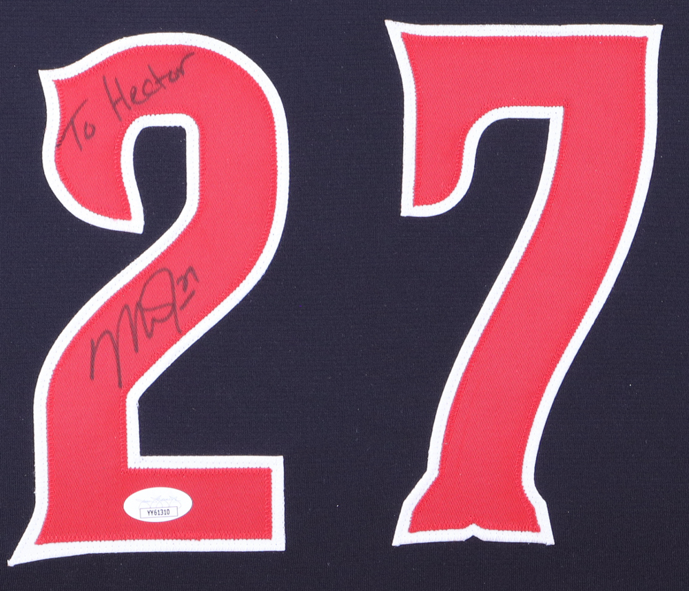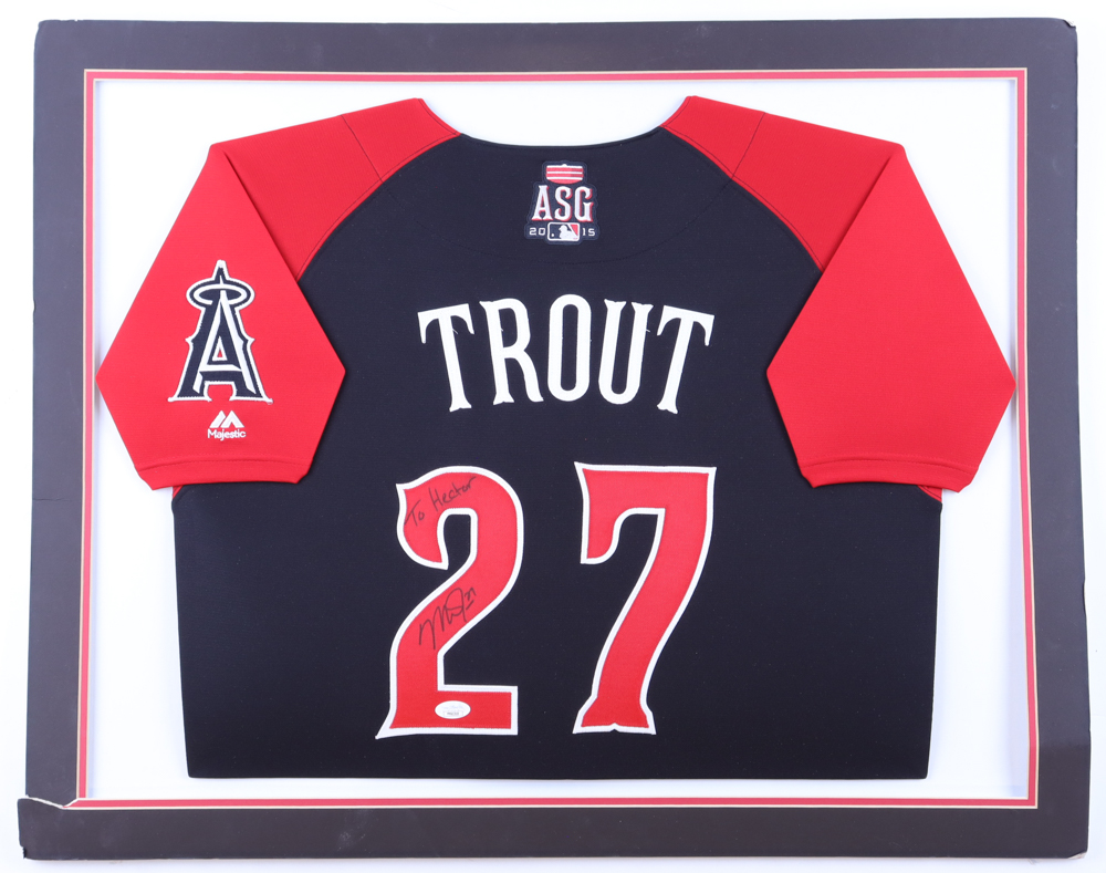 Custom matting measures 24" x 30" in size. Features a Majestic Los Angeles Angels jersey that has been hand-signed by Mike Trout. The autograph has been personalized "To Hector."