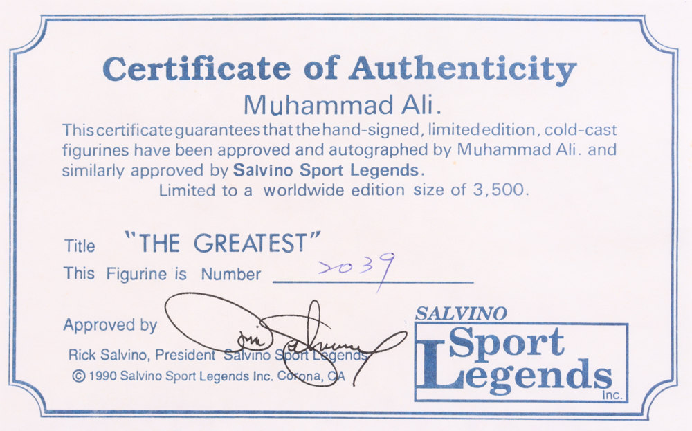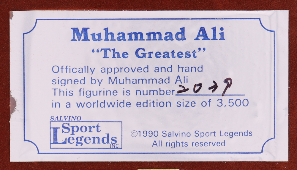Ceramic figurine measures approximately 9" tall, and has been hand-signed on the base of the figurine by Muhammad Ali (D. 2016, HOF). This item is limited edition # 2039 / 3500. Please see photos for more details regarding the condition of the figure.