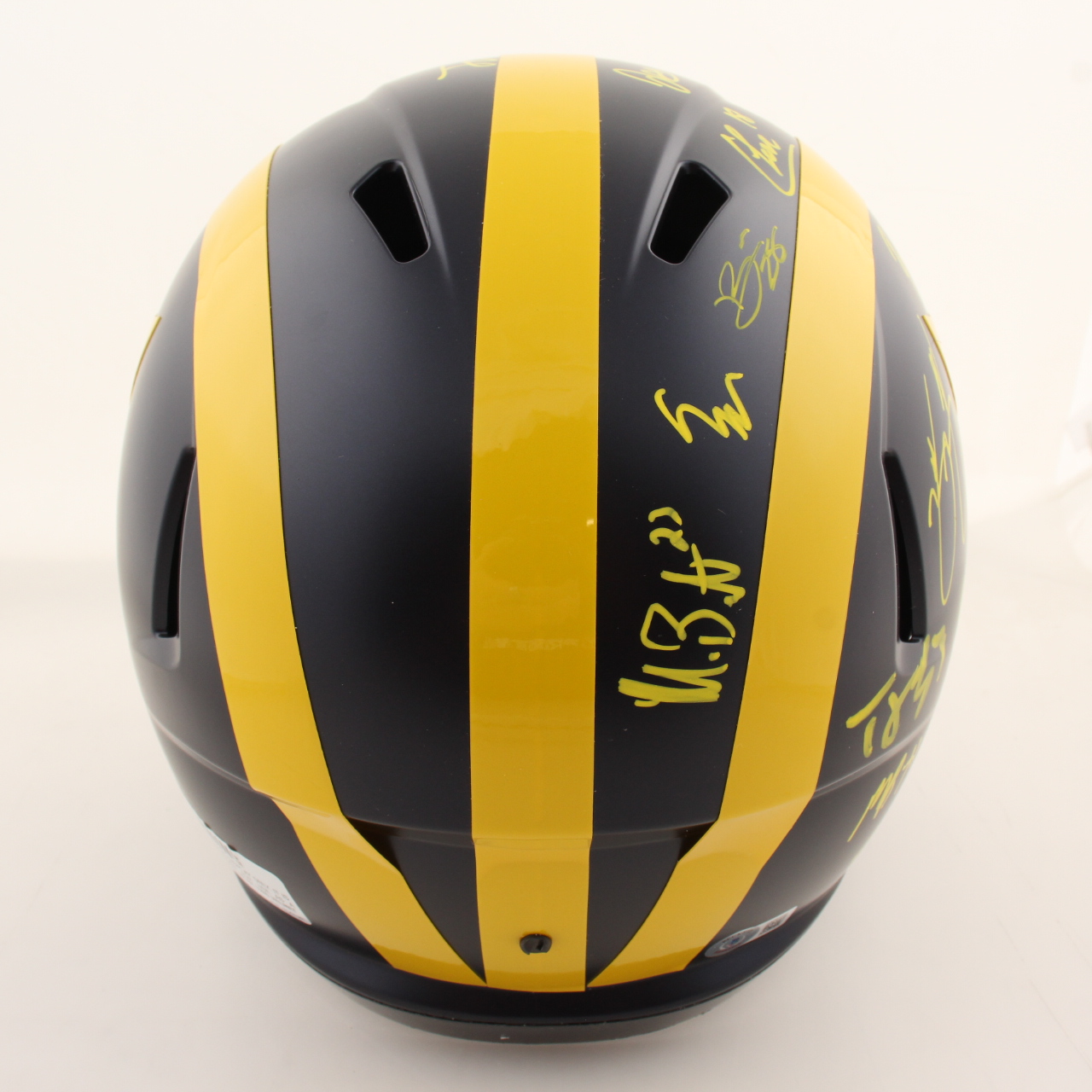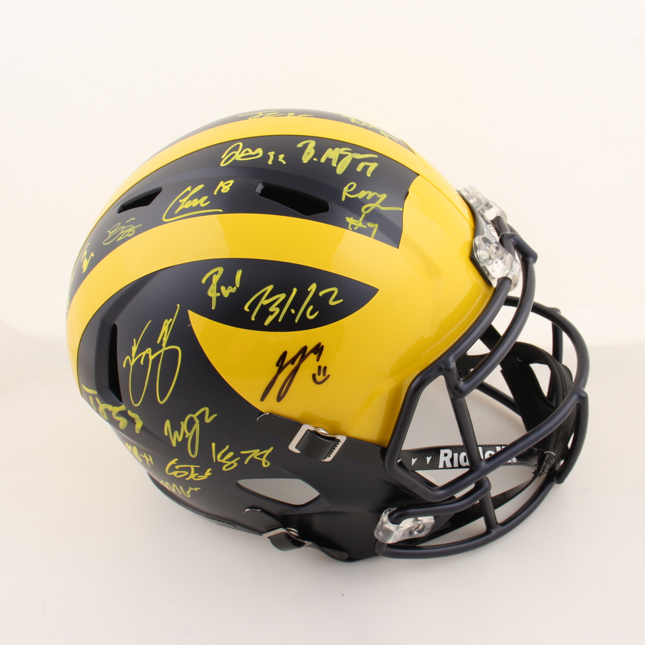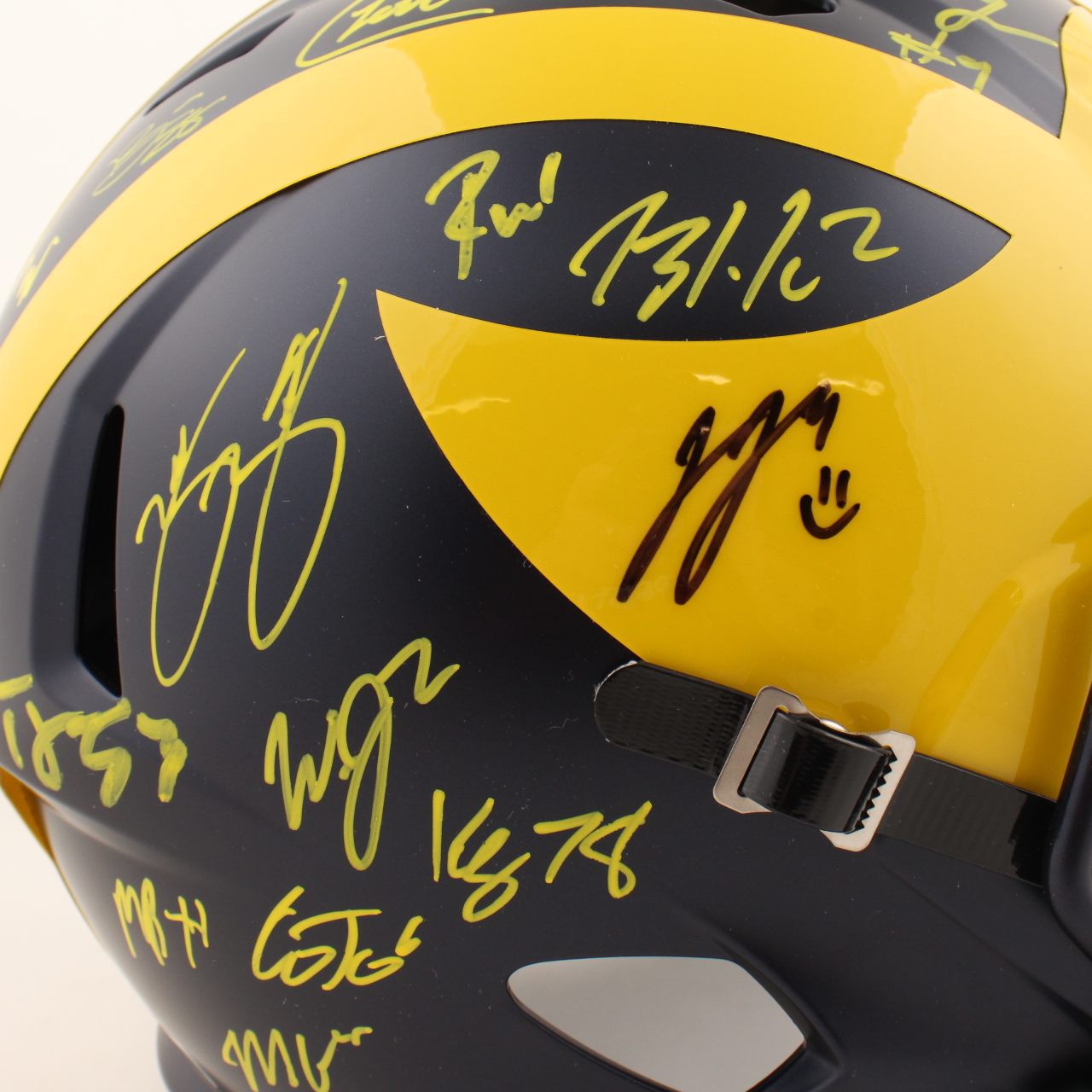 Riddell Michigan Wolverines full-size replica Speed helmet. Team-signed by (18) members of the 2023 Michigan Wolverines National Championship team. Autographs include J.J. McCarthy, Mike Barrett, Max Bredeson, Junior Colson, Blake Corum, Mason Graham, Kenneth Grant, Benjamin Hall, Jaylen Harrell, Kris Jenkins, Cornelius Johnson, Will Johnson, Trente Jones, Colston Loveland, Braiden McGregor, Rod Moore, Semaj Morgan, Roman Wilson and Zak Zinter.
