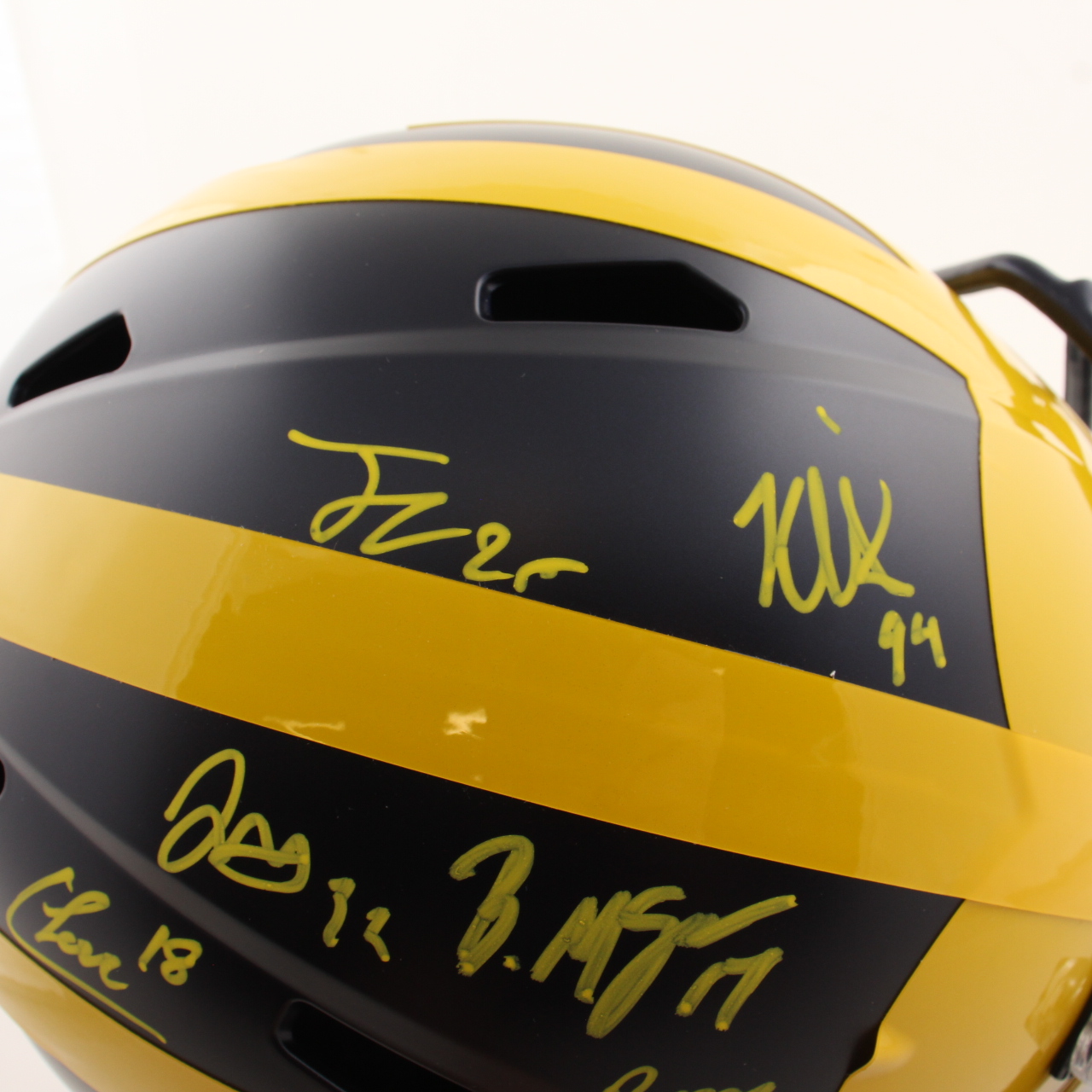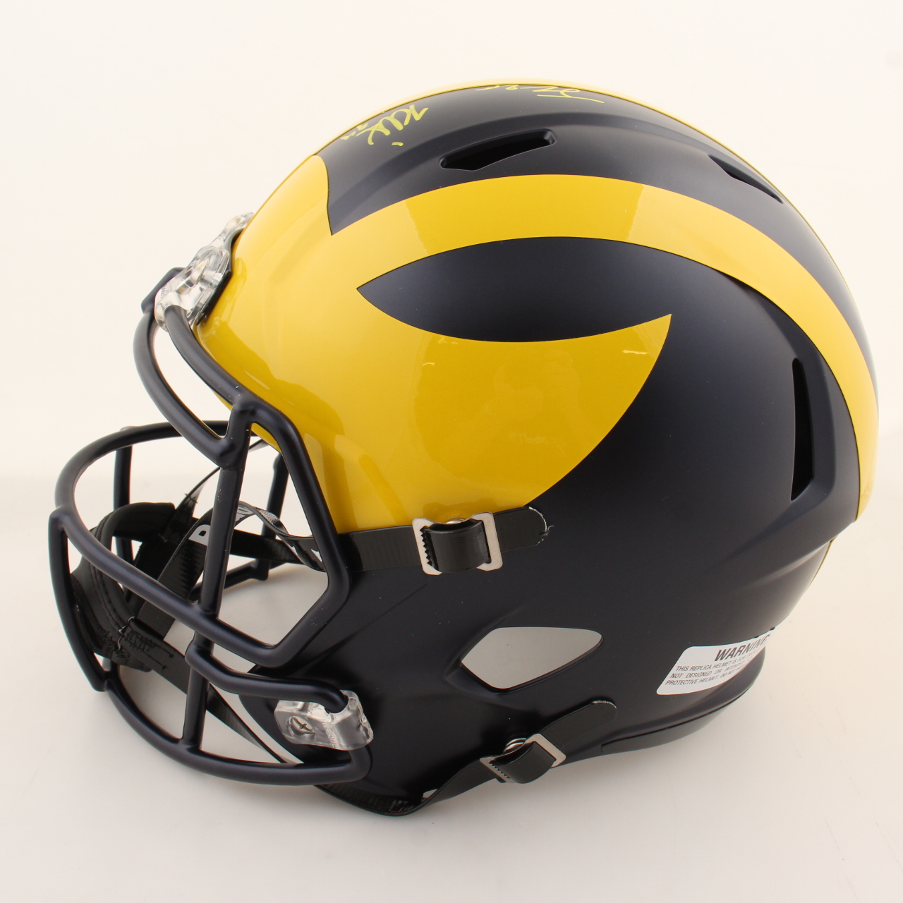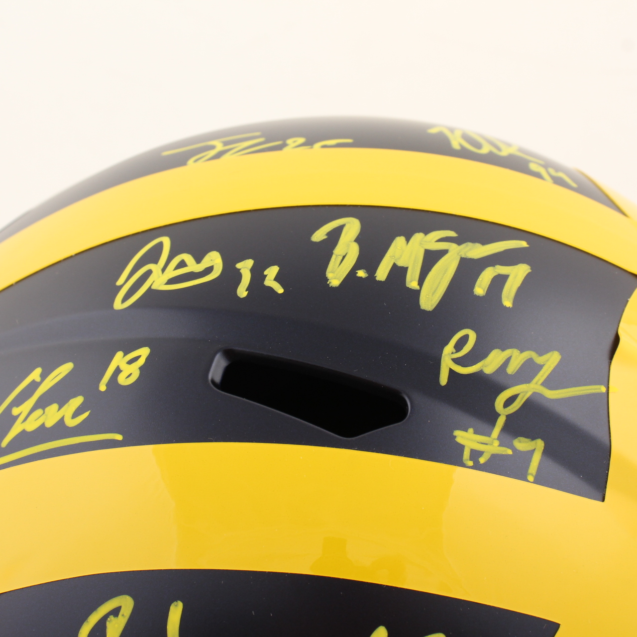 Riddell Michigan Wolverines full-size replica Speed helmet. Team-signed by (18) members of the 2023 Michigan Wolverines National Championship team. Autographs include J.J. McCarthy, Mike Barrett, Max Bredeson, Junior Colson, Blake Corum, Mason Graham, Kenneth Grant, Benjamin Hall, Jaylen Harrell, Kris Jenkins, Cornelius Johnson, Will Johnson, Trente Jones, Colston Loveland, Braiden McGregor, Rod Moore, Semaj Morgan, Roman Wilson and Zak Zinter.