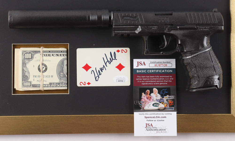 Custom frame measures approximately 18.25" x 29.25" in size and features a playing card that has been hand-signed by Henry Hill (D. 2012). Display also features movie poster print, prop money stack and replica prop pistol.