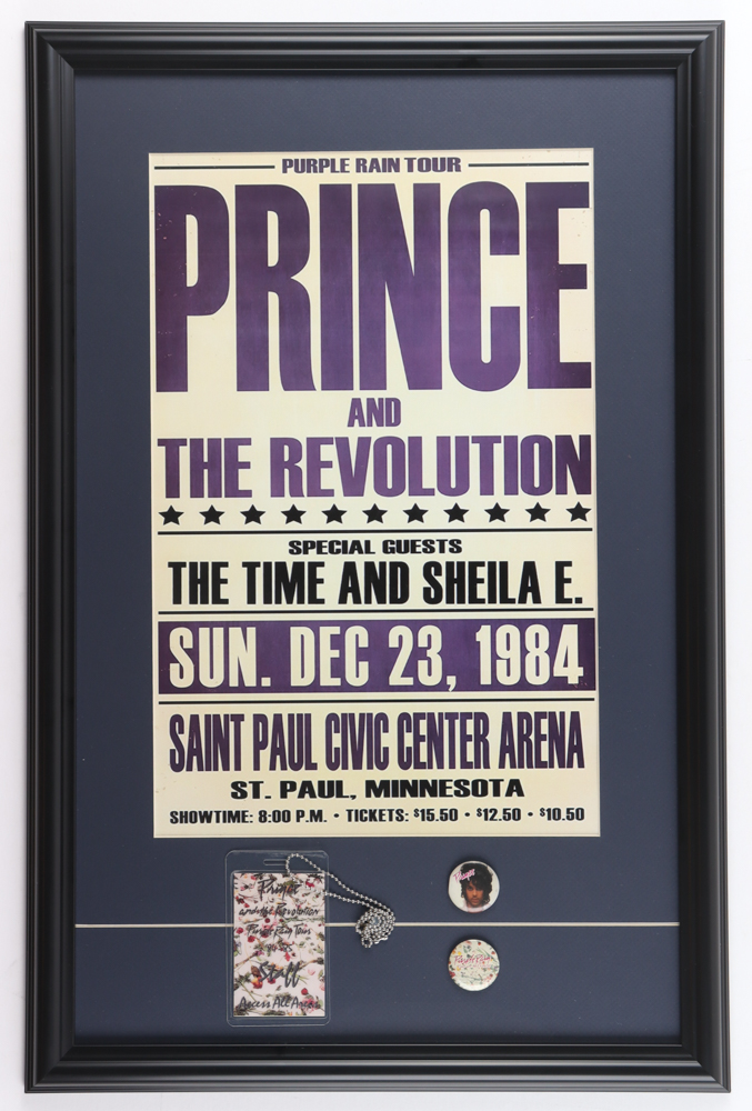 Custom frame measures approximately 17.25" x 26.25" in size and features a "Prince and the Revolution Purple Rain Tour" concert poster, original 1984-1985 vintage backstage pass, and (2) concert pins.