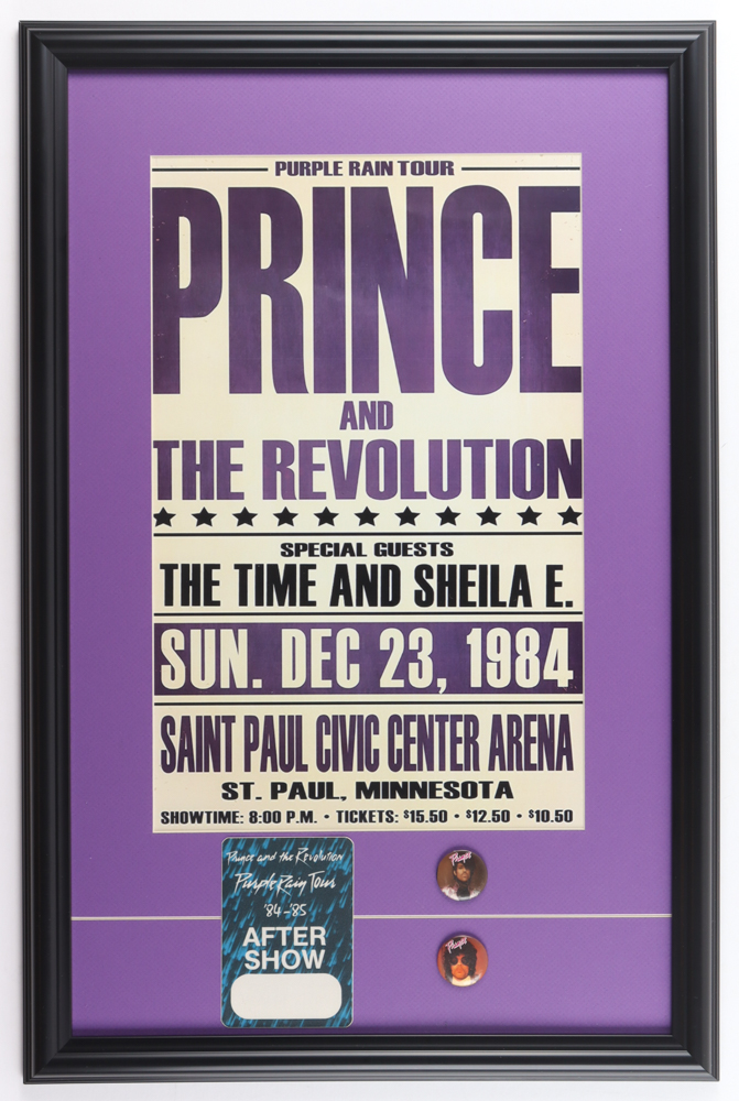 Custom frame measures approximately 17.25" x 26.25" in size and features a "Prince and the Revolution Purple Rain Tour" concert poster, original 1984-1985 vintage after show pass, and (2) concert pins.