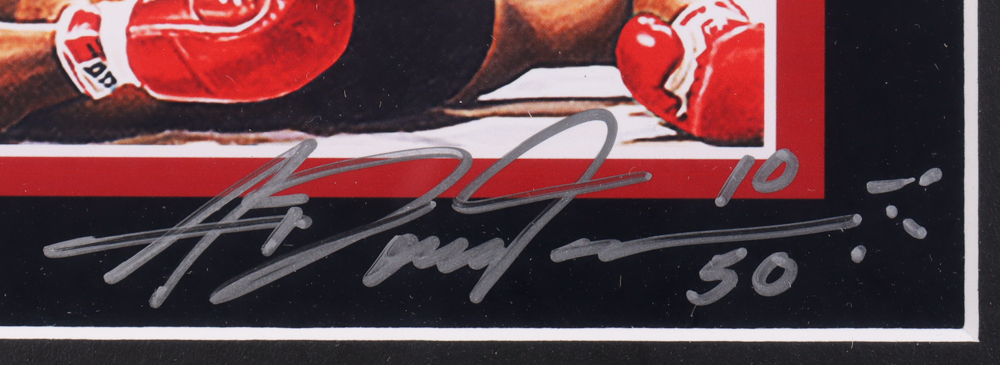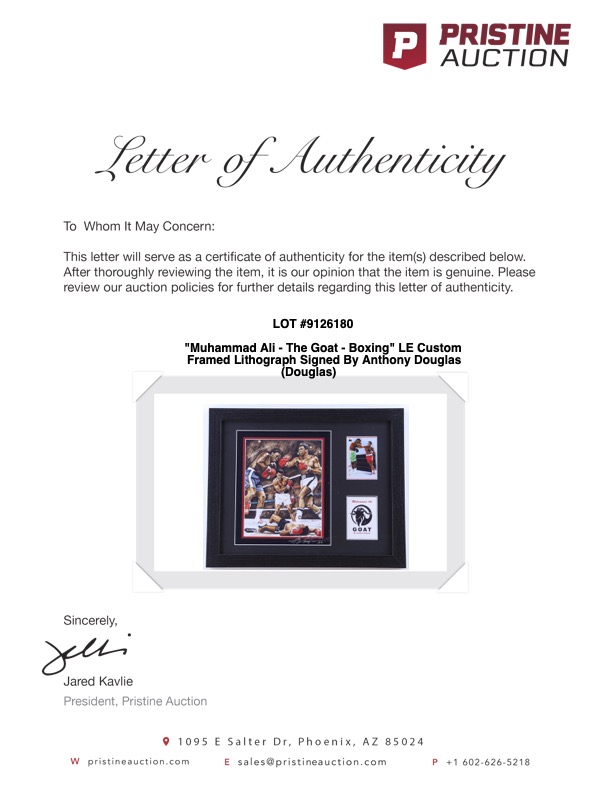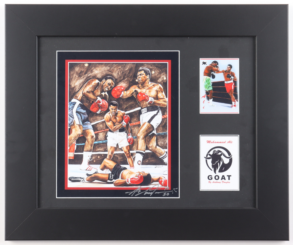 Custom frame measures 12.5" x 15.5" in size and features a lithograph of Muhammad Ali (D. 2016, HOF) that has been hand-signed by the artist, Anthony Douglas. The display is limited edition and is numbered #10/50.