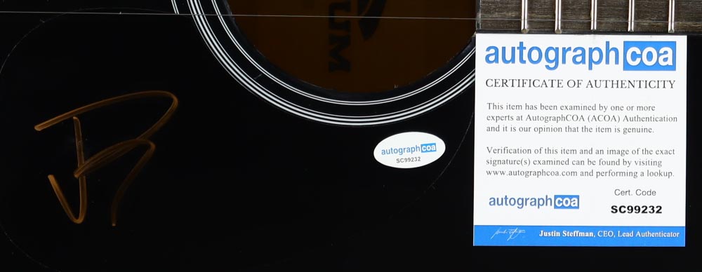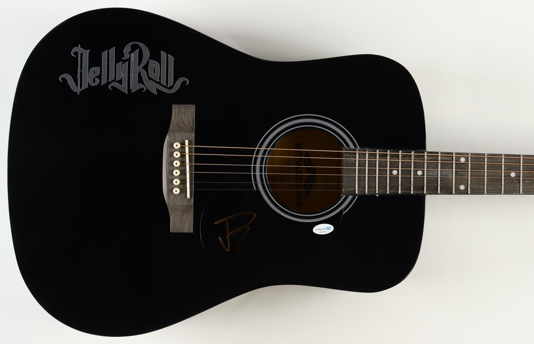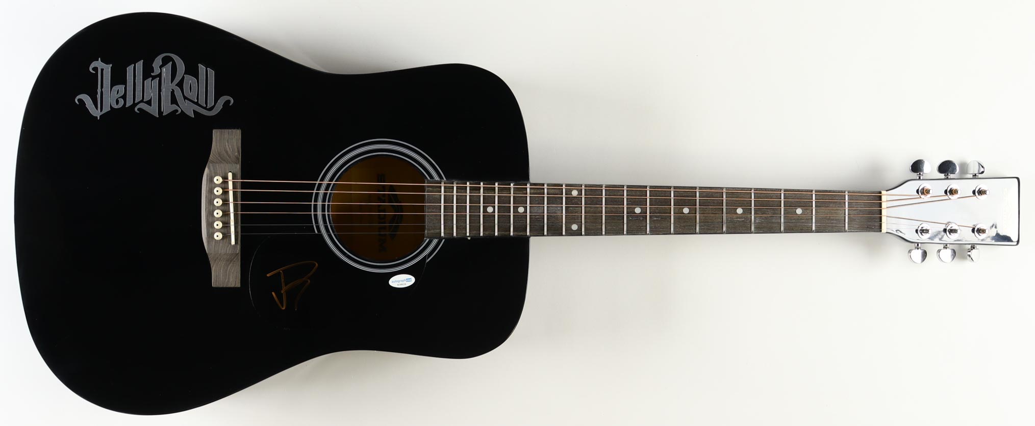 Acoustic guitar measures approximately 39" in length and has been hand-signed on the pickguard by Jelly Roll.