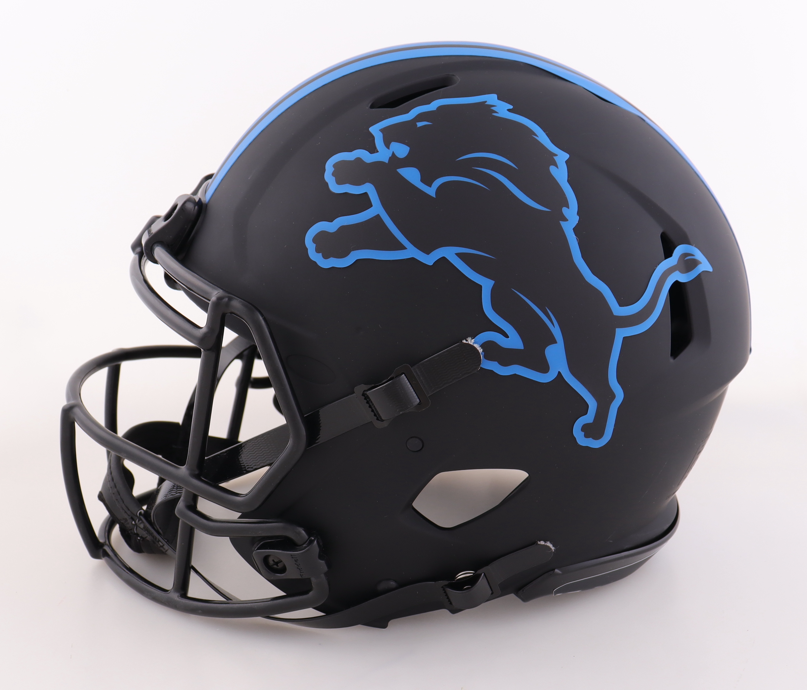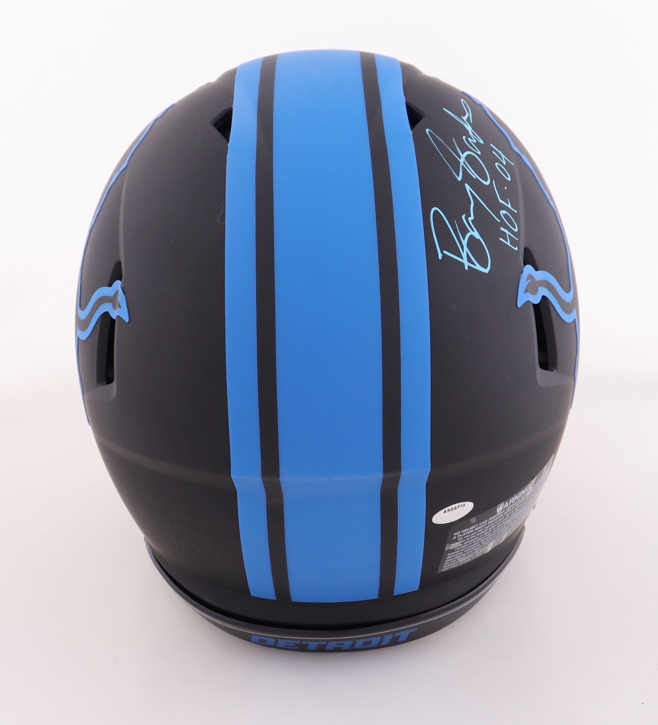 Riddell Detroit Lions full-size authentic on-field eclipse alternate speed helmet has been hand-signed and inscribed by Barry Sanders (HOF).