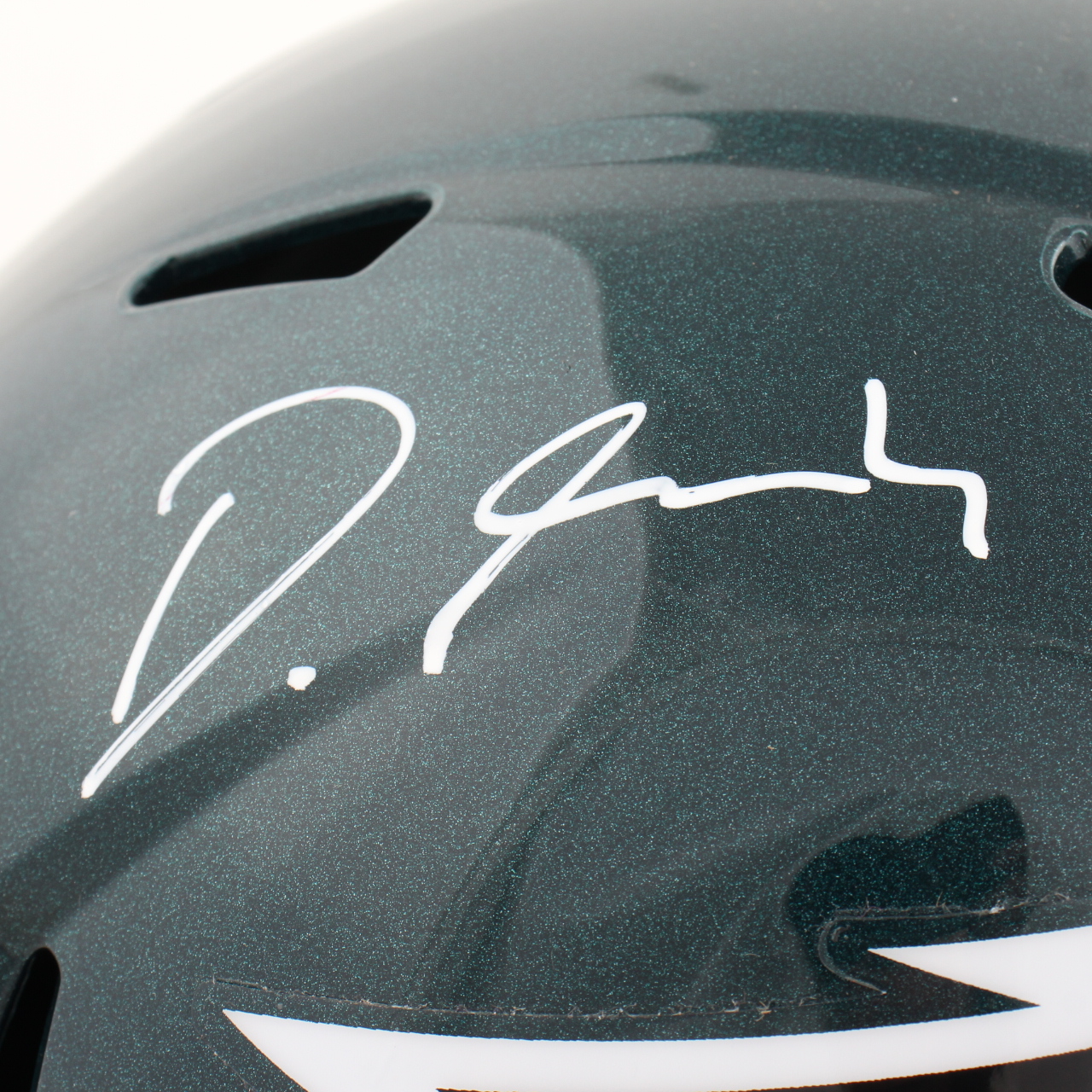 Riddell Philadelphia Eagles Full-Size replica Speed helmet has been hand-signed by DeVonta Smith.