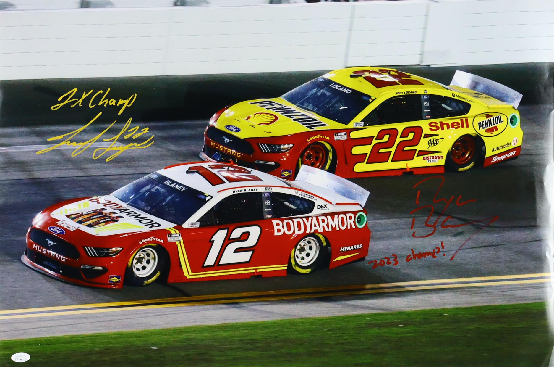 Photo measures 20" x 30" in size and has been hand-signed and inscribed by Joey Logano and Ryan Blaney.