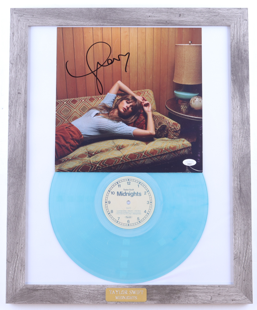 Custom frame measures approximately 18" x 22" in size. Features a "Midnights" record album insert that has been hand-signed by Taylor Swift. The display also includes a vinyl record.