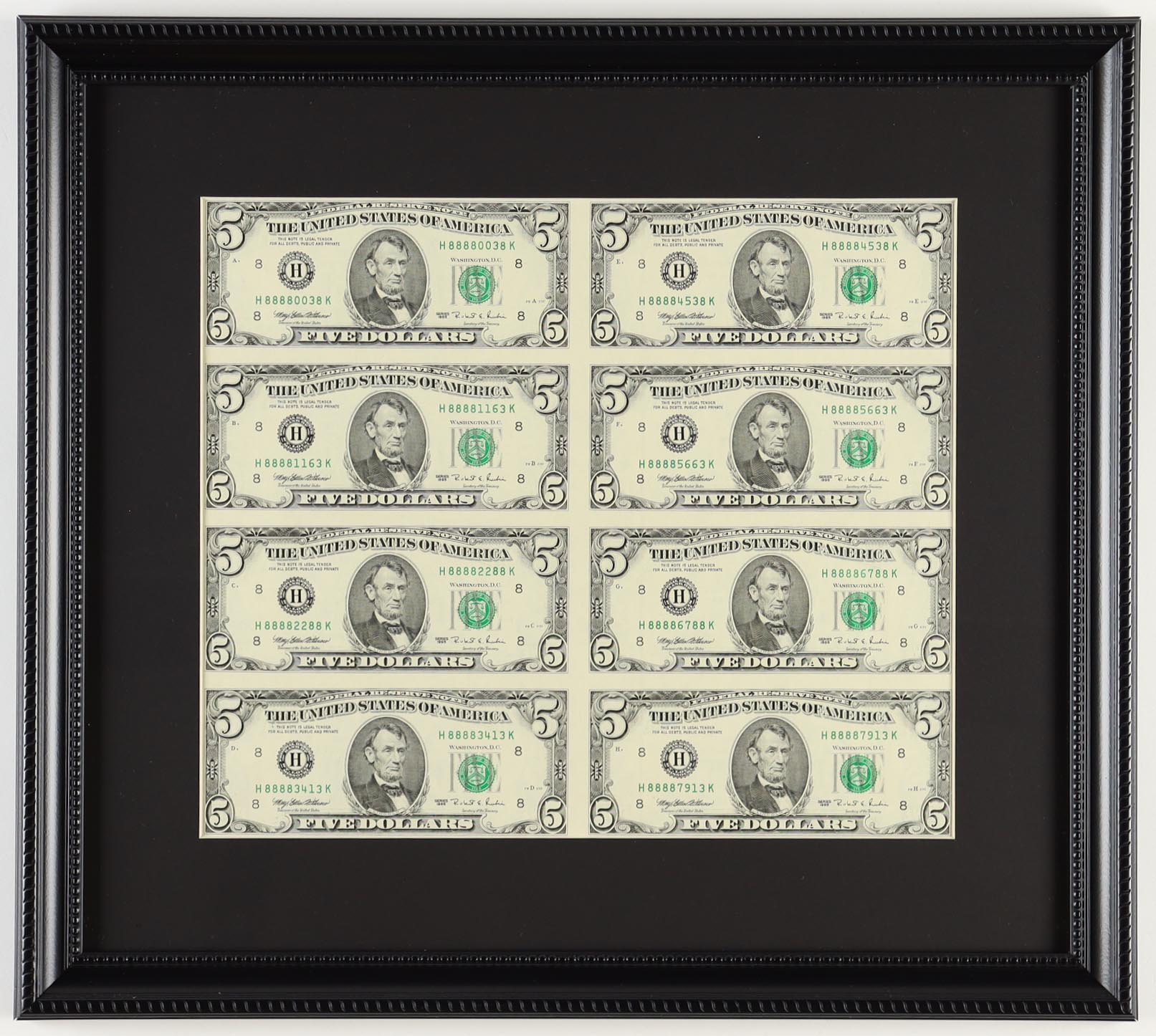1995 (8) U.S. $5 Five Dollar Bill Uncut Sheet Custom Framed Display