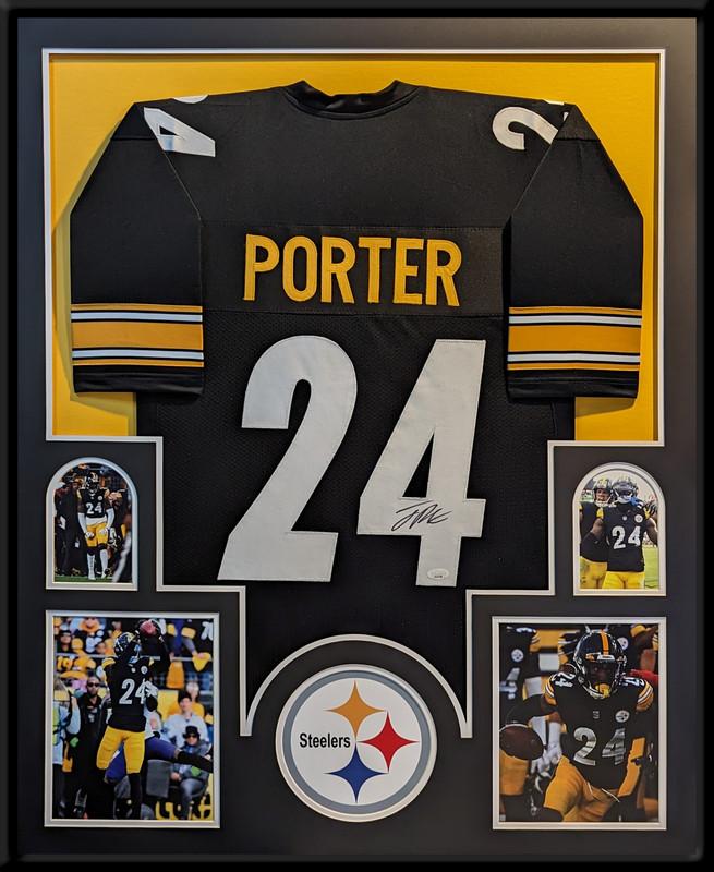 Custom frame measures 34" x 42" in size and features a jersey that has been hand-signed by Joey Porter Jr.