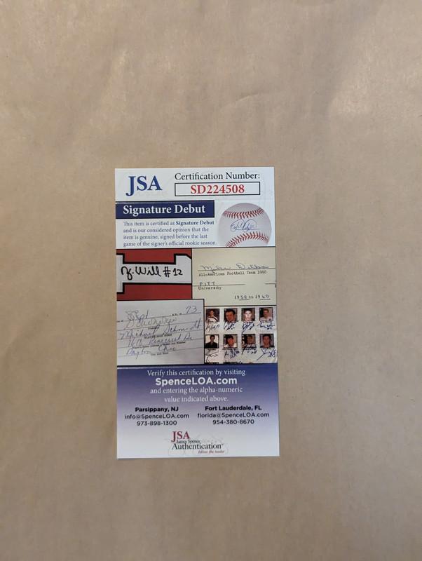 The autograph(s) includes an official James Spence Authentication (JSA) "Signature Debut" hologram and COA. "Signature Debut" is the autographed memorabilia equivalent to a rookie card. The JSA definition of a "Signature Debut" is as follows: "Any item that is autographed and received by JSA prior to the last game of the signer's official rookie season.
