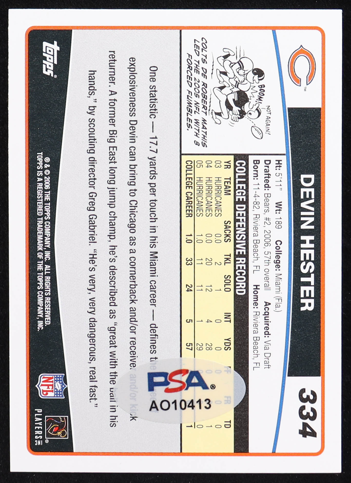 Devin Hester Signed 2006 Topps #334 RC (PSA)