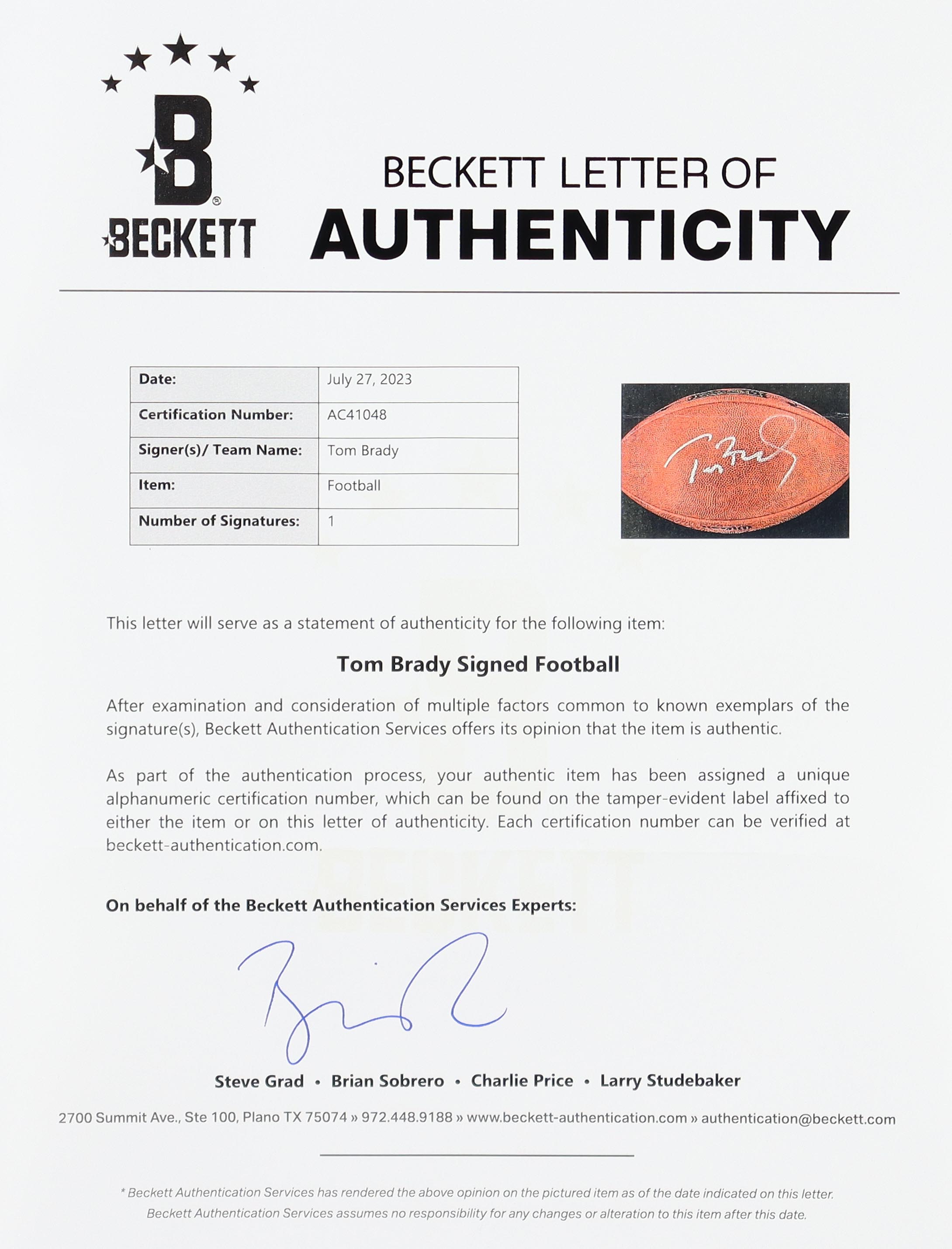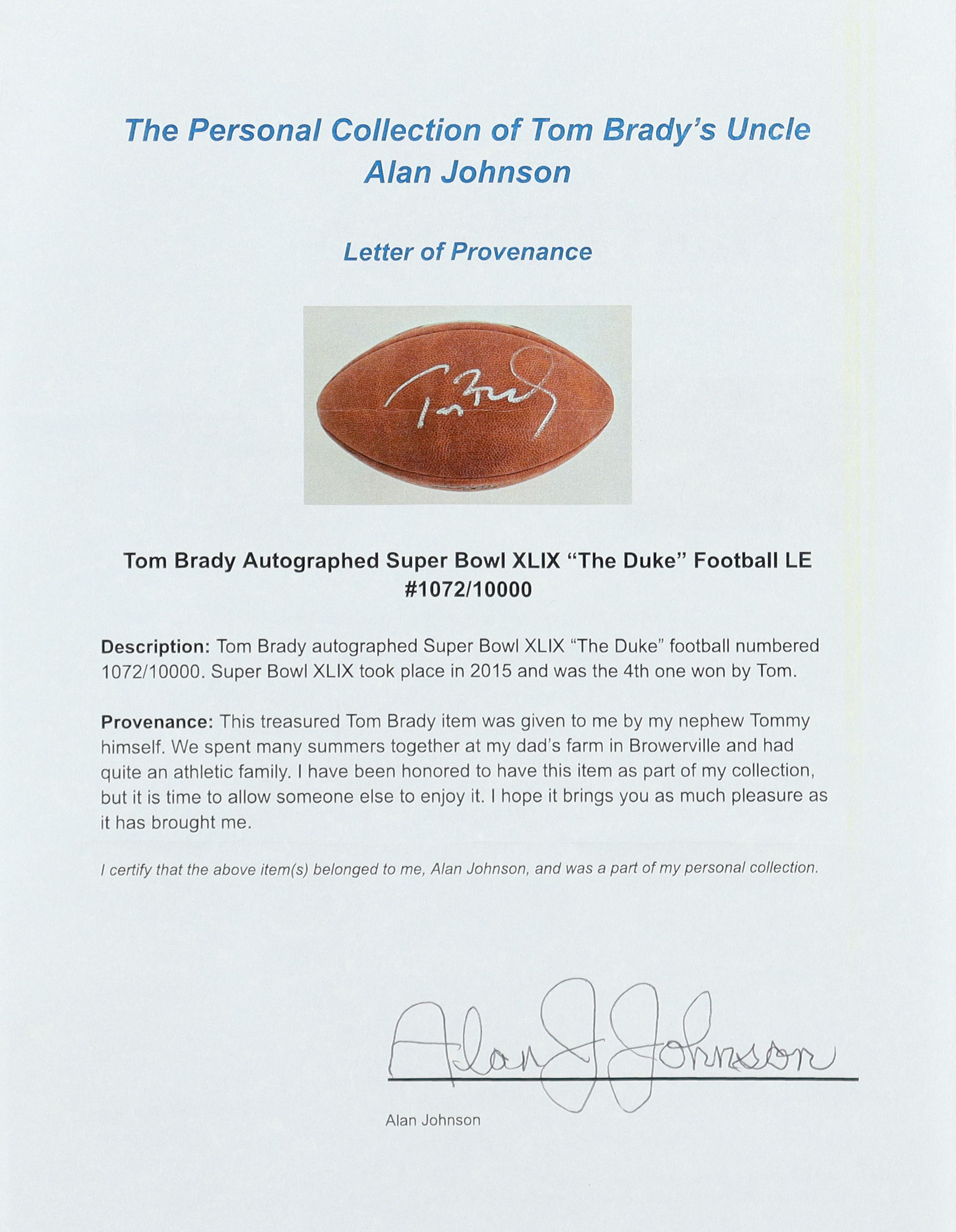 The ball is limited edition and hand-numbered #1072/10000. The ball comes from the personal collection of Tom Brady's uncle Alan Johnson and includes an letter of provenance signed by Alan Johnson.